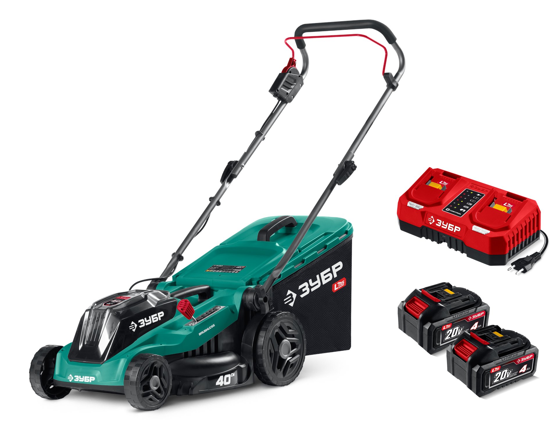 Газонокосилка аккумуляторная ЗУБР 40 В (2×20 В), 400 мм, 2 АКБ LMS (4 Ач), бесщеточная ГКЛ-4040-42 — современная аккумуляторная газонокосилка сделает процесс стрижки травы более удобным и эффективным.