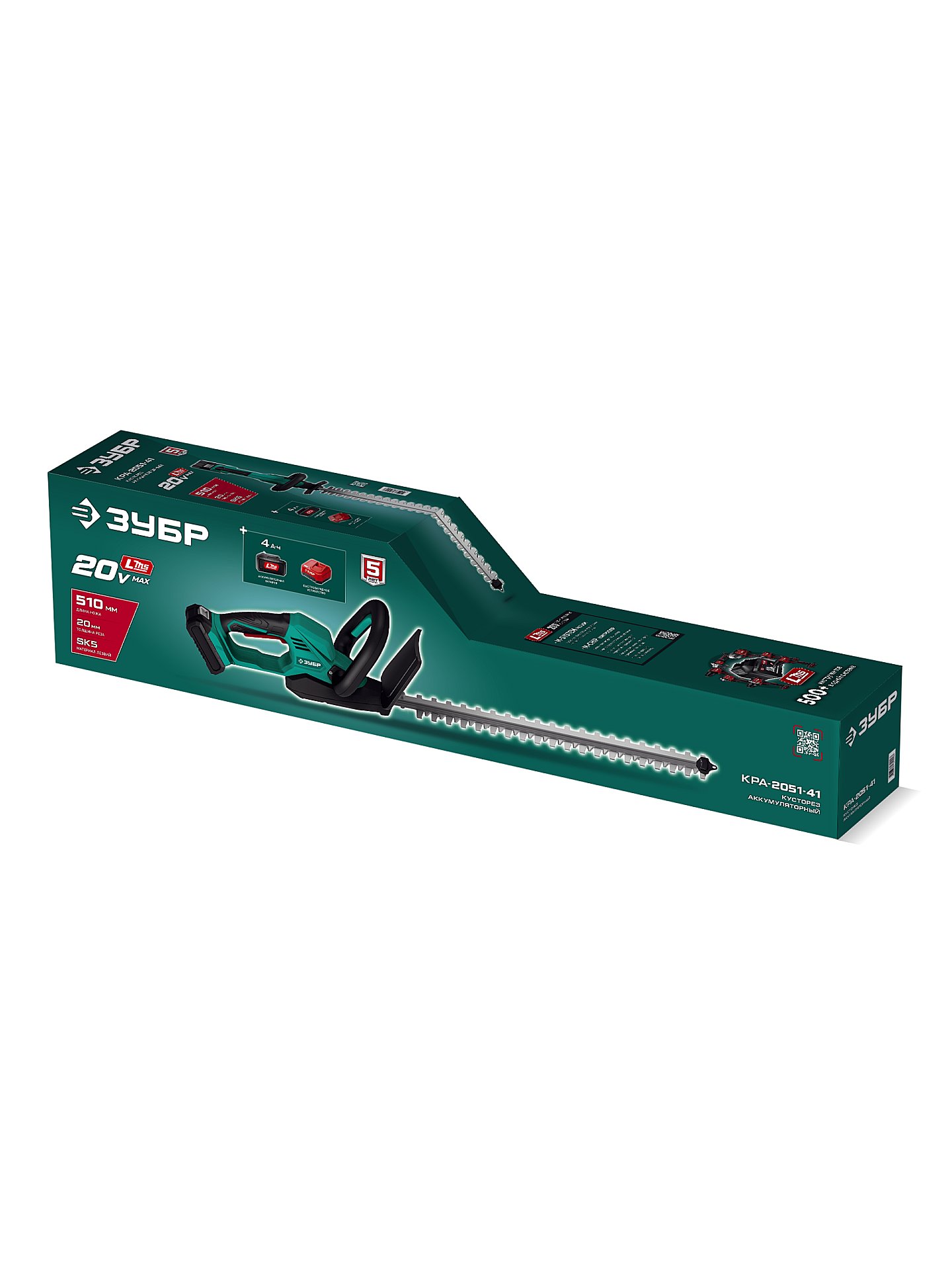 Кусторез аккумуляторный ЗУБР 20 В, 510 мм, 1 АКБ LMS (4 Ач) КРА-2051-41 — предназначен для ухода за живыми изгородями, стрижки кустарников и деревьев.