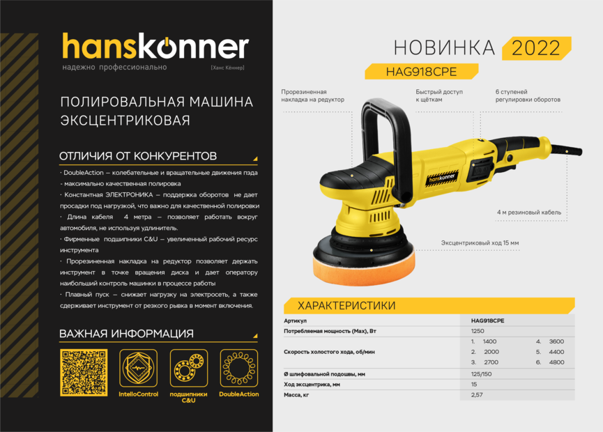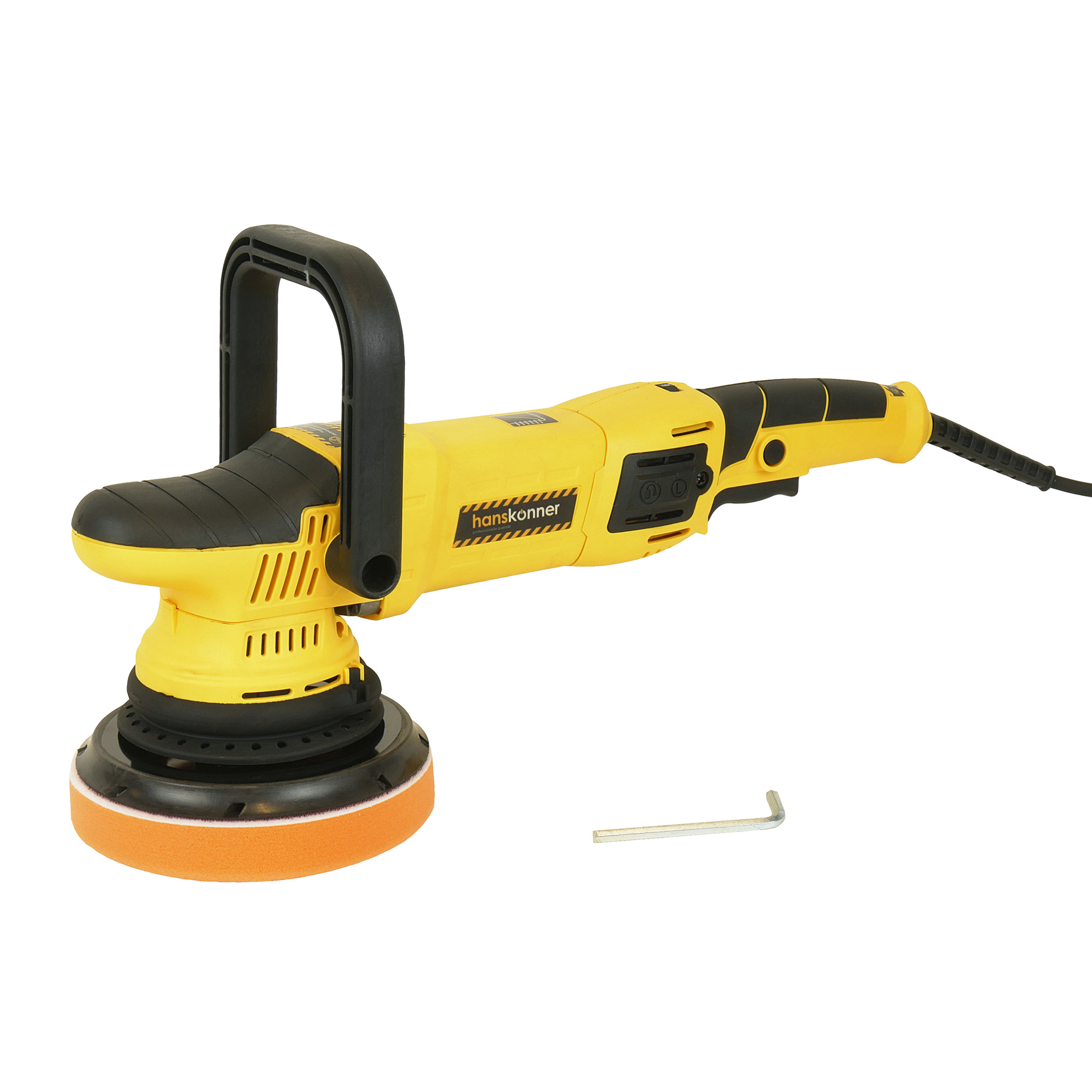 Полировальная машина Hanskonner HAG918CPE роторного типа — компактный и удобный электроинструмент для полирования поверхностей, в том числе с грунтовым и лакокрасочным покрытием. Подходит для удаления частиц пыли и мелких механических дефектов, устранения эффекта голограммы и восстановления блеска лакокрасочного покрытия