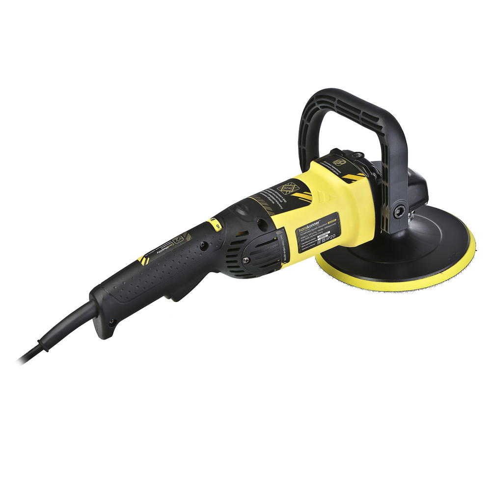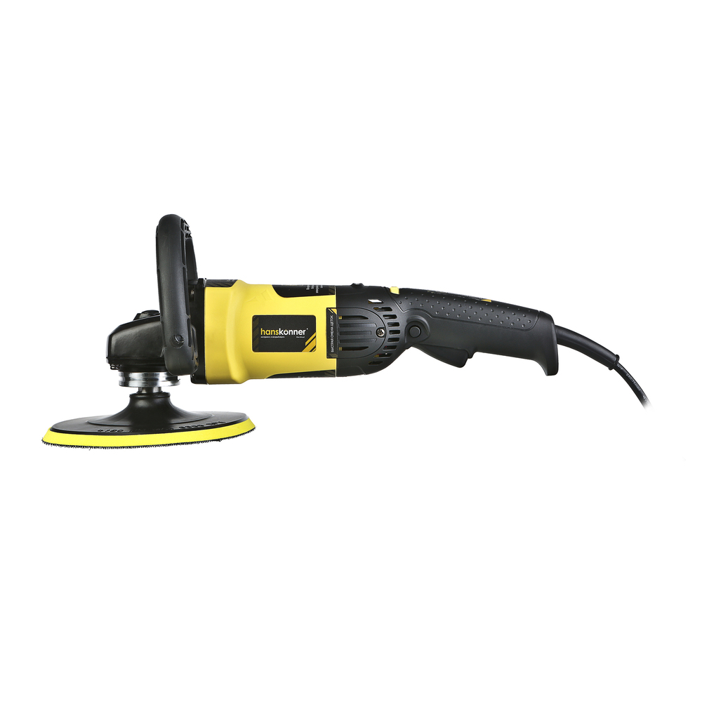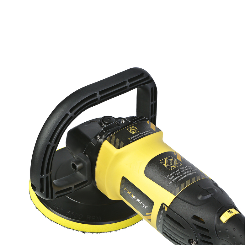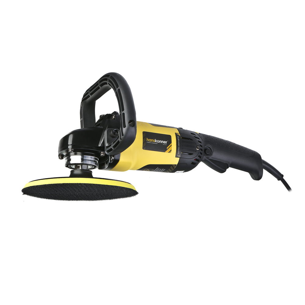 Hanskonner HAG918CP – мощная универсальная полировальная машина под рабочий диаметр диска 180 мм. Имеет компоновку с длинной рукоятью и рассчитана под двуручный хват, благодаря чему достигается наилучший контроль в процессе работы. Также, комфорту эксплуатации инструмента, способствуют его выверенные массогабаритные показатели, нейтральный центр тяжести и отличная эргономика. Модель оснащена производительным 1400 Вт электромотором, запас мощности которого позволяет эффективное использование машины не только при полировке мелких элементов, но и при обработке больших плоскостей. Важной особенностью полировальной машины Hanskonner HAG918CP является наличие электронного блока EPM (Electronic Power Manager), который позволяет поддерживать стабильную частоту вращения на валу шпинделя под нагрузкой, обеспечивает плавный пуск и возможность регулировки оборотов в широком диапазоне (500 – 3000 об/ мин) – пользователь может настроить оптимальную частоту вращения вала шпинделя в соответствии с обрабатываемым материалом и типом полировальной пасты. Для обеспечения высокой надежности инструмента особое внимание уделено наиболее нагруженным элементам конструкции: электромотор покрыт несколькими изоляционными слоями термостойкого лака, повышенной прочностью обладают шестерни редуктора, используются высококачественные фирменные подшипники NSK. Удобству обслуживания способствует функция быстрого доступа к щеткам, позволяющая производить их замену без демонтажа элементов корпуса. Сетевой кабель имеет резиновую изоляцию, что сохраняет его гибкость и эластичность в условиях низких температур, а четырехметровая длина кабеля дает возможность использовать инструмент без применения дополнительного сетевого удлинителя, обеспечивая рабочую зону площадью до 50 м2.