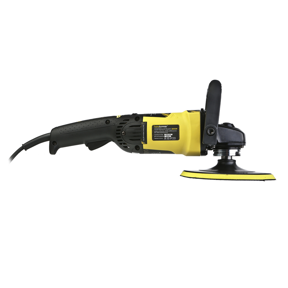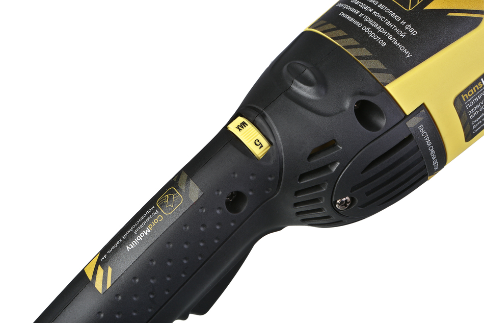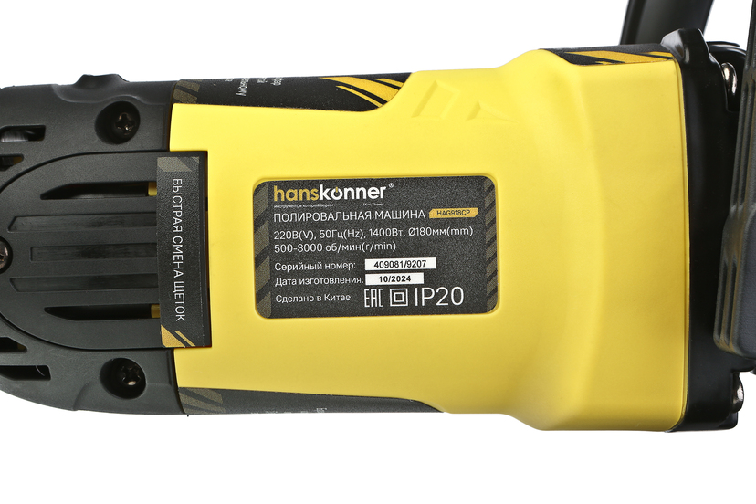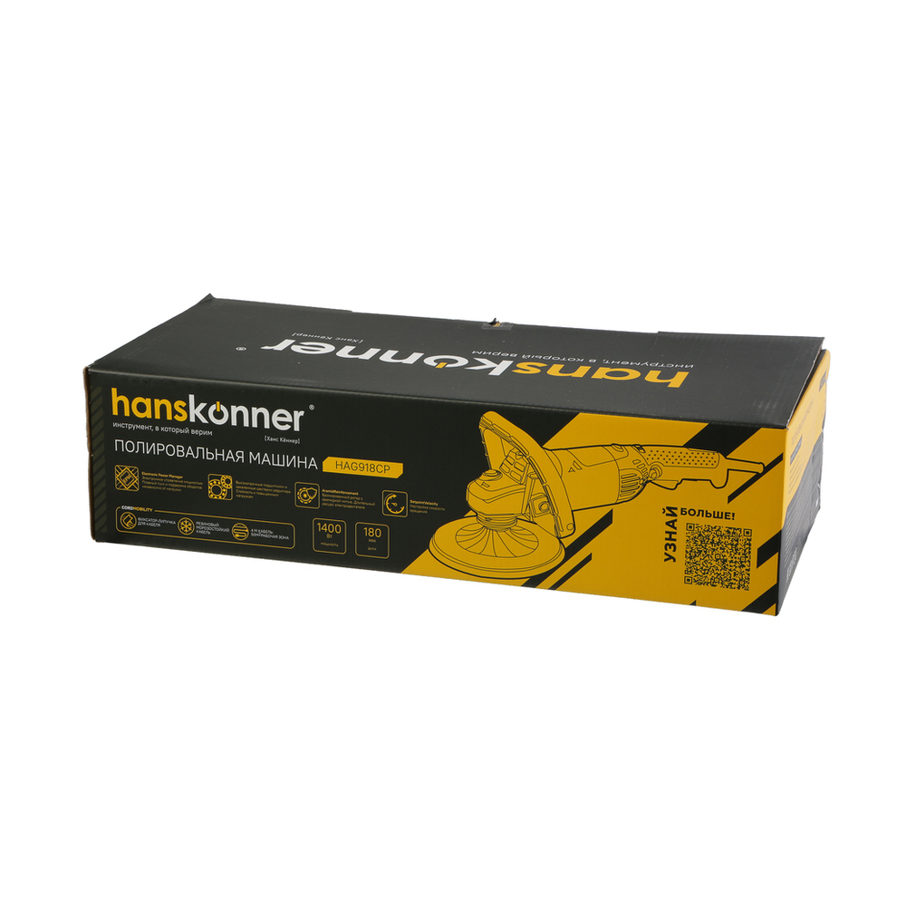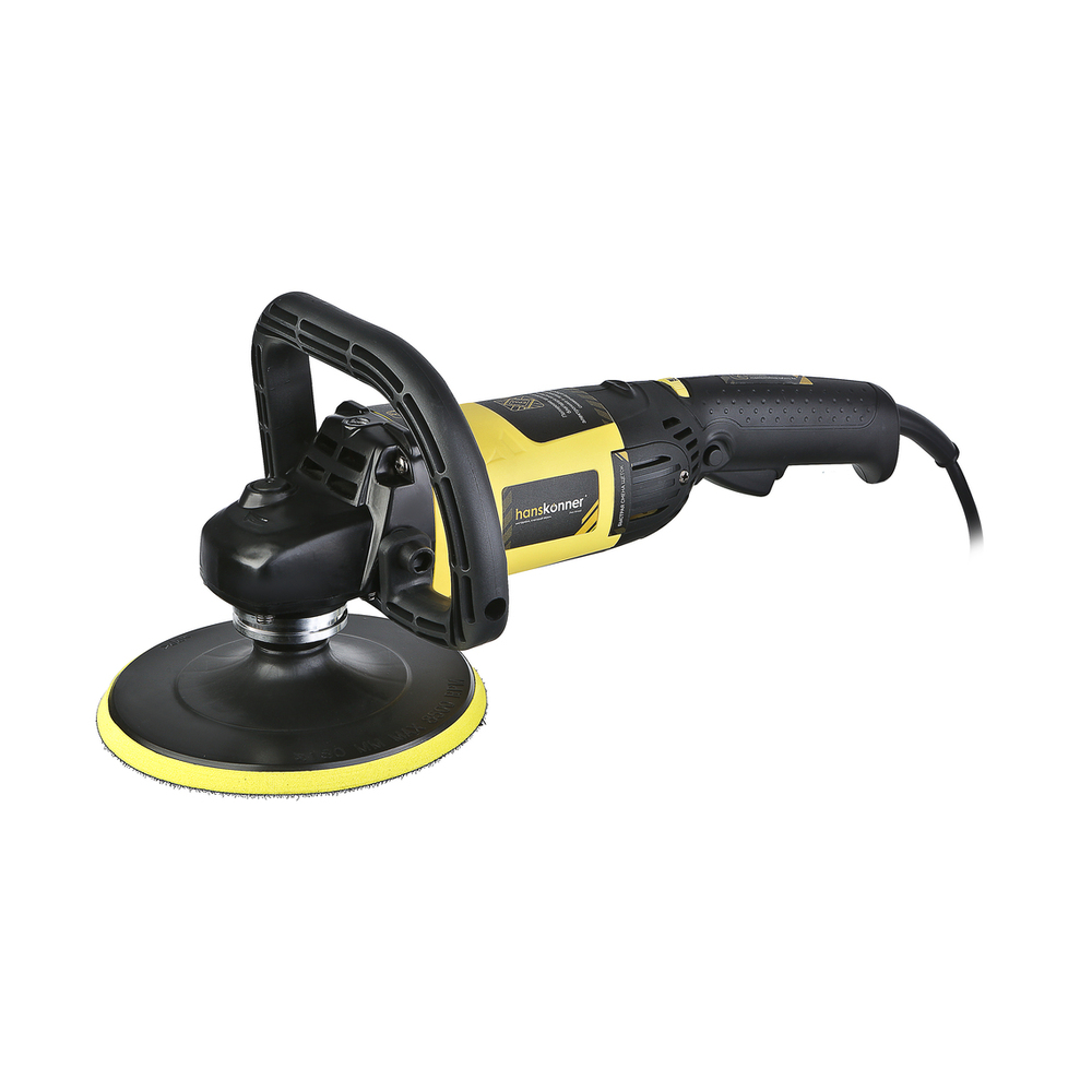 Hanskonner HAG918CP – мощная универсальная полировальная машина под рабочий диаметр диска 180 мм. Имеет компоновку с длинной рукоятью и рассчитана под двуручный хват, благодаря чему достигается наилучший контроль в процессе работы. Также, комфорту эксплуатации инструмента, способствуют его выверенные массогабаритные показатели, нейтральный центр тяжести и отличная эргономика. Модель оснащена производительным 1400 Вт электромотором, запас мощности которого позволяет эффективное использование машины не только при полировке мелких элементов, но и при обработке больших плоскостей. Важной особенностью полировальной машины Hanskonner HAG918CP является наличие электронного блока EPM (Electronic Power Manager), который позволяет поддерживать стабильную частоту вращения на валу шпинделя под нагрузкой, обеспечивает плавный пуск и возможность регулировки оборотов в широком диапазоне (500 – 3000 об/ мин) – пользователь может настроить оптимальную частоту вращения вала шпинделя в соответствии с обрабатываемым материалом и типом полировальной пасты. Для обеспечения высокой надежности инструмента особое внимание уделено наиболее нагруженным элементам конструкции: электромотор покрыт несколькими изоляционными слоями термостойкого лака, повышенной прочностью обладают шестерни редуктора, используются высококачественные фирменные подшипники NSK. Удобству обслуживания способствует функция быстрого доступа к щеткам, позволяющая производить их замену без демонтажа элементов корпуса. Сетевой кабель имеет резиновую изоляцию, что сохраняет его гибкость и эластичность в условиях низких температур, а четырехметровая длина кабеля дает возможность использовать инструмент без применения дополнительного сетевого удлинителя, обеспечивая рабочую зону площадью до 50 м2.