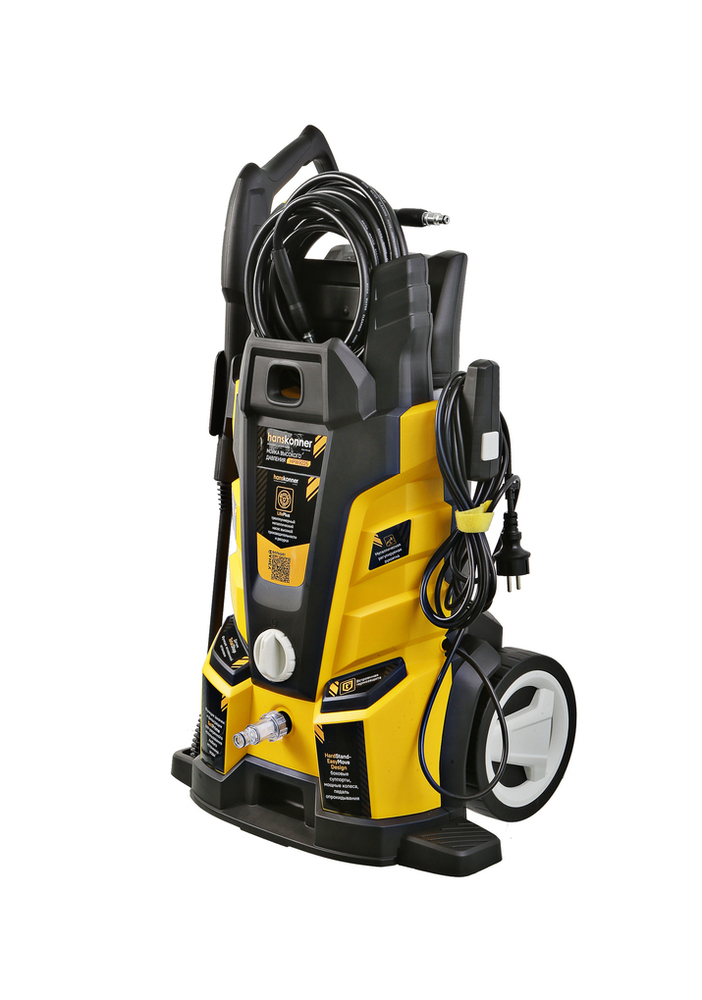 Hanskonner HPW9225 – универсальная и производительная мойка высокого давления. Представляет оптимальное сочетание производительности, выверенной эргономики, и широкого функционала. Модель оснащена мощным 2500 Вт электромотором и трёхплунжерной алюминиевой помпой LifePlus, обеспечивающей производительность в 360 л/час, и рабочее давление в 130 бар – все это способствует быстрому и эффективному удалению даже самых стойких загрязнений. Безопасную и долговечную работу мойки гарантируют встроенная термозащита и автоматическая система с микровыключателем мгновенной остановки двигателя TotalStop. Важная особенность мойки Hanskonner HPW9225 – наличие функции самовсасывания SelfPrime, позволяющей полноценную эксплуатацию устройства даже при отсутствии условий для подключения к стационарному водопроводу – для забора воды могут использоваться любые открытые источники: ведро, бочка, бак и т д. Модель комплектуется длинным cемиметровым шлангом высокого давления, обеспечивающим значительную рабочую зону: он позволяет свободно мыть легковой автомобиль, очищать крыши дачных построек и другие объекты без необходимости передвигать мойку с места на место. Легкости подключения шланга и оснастки способствуют специальные быстросъемные соединения QuickConnect. Для предотвращения хранения мойки с остатками воды, предусмотрена специальная защита – пользователь не сможет отсоединить шланг от пистолета, пока на выключенном инструменте не будут слиты остатки воды нажатием на клавишу пистолета. Удобство перемещения достигается благодаря телескопической выдвижной рукояти, наличию педали опрокидывания для переведения мойки в транспортное положение и большим колесам. Модель Hanskonner HPW9225 имеет расширенную базовую комплектацию, куда помимо прочего включены две фрезы: универсальная веерная с регулируемой зоной охвата (удаление загрязнений средней сложности) и роторная TurboNozzle, обеспечивающая мощный вихревой поток (удаление сильных загрязнений), а также пеногенератор с регулятором подачи пены.