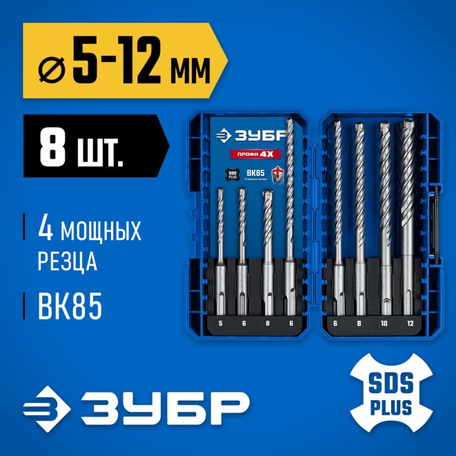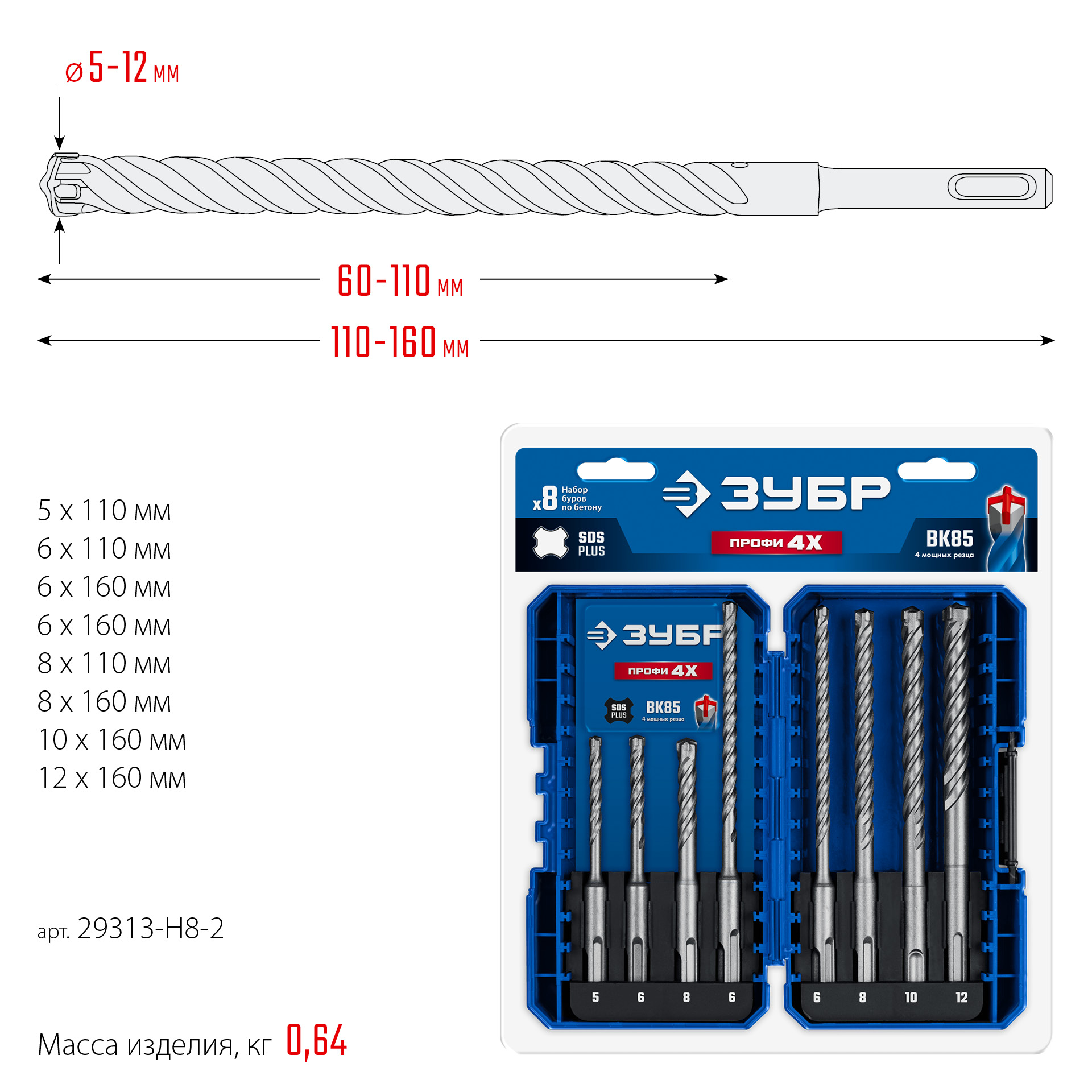 Набор буров SDS-plus ЗУБР 29313-H8-2, предназначен для сверления отверстий в бетоне, граните, кирпичной кладке, камне и твердом известняке.