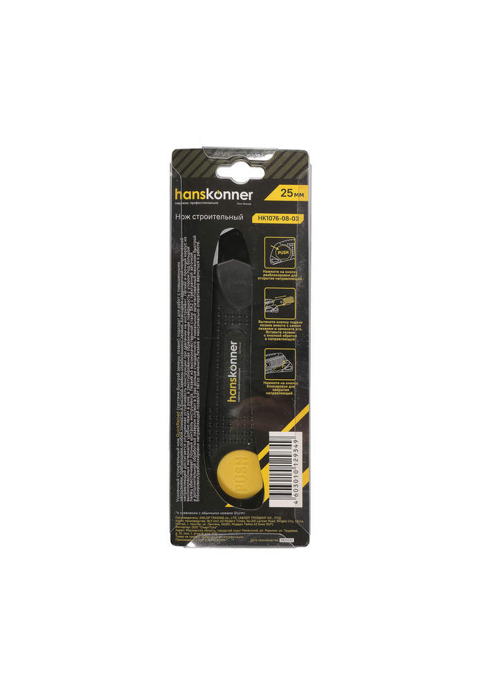 Строительный нож Hanskonner QuickReload (быстрая замена лезвия) подходит для работ с повышенными нагрузками, требующими особой точности и быстрой замены отрабо танного лезвия.. Благодаря сверхпрочной металлической направляющей достигается улучшенная устойчивость конструкции п ри давлении на инструмент. Лёгкий и прочный корпус из высококлассных материалов удобно лежит в руке, а текстурирован ная обрезиненная поверхность с упором под большой палец обеспечивает полный контроль инструмента. Лезвие из высо кокачественной стали SK2 c трёхгранной заточкой и дополнительной обработкой лазером служит в 5 раз дольше стан дартного. Уникальный запатентованный механизм быстрой блокировки/разблокировки направляющей позволит легко заменить лезвие и максимально оперативно вернуться к работе.