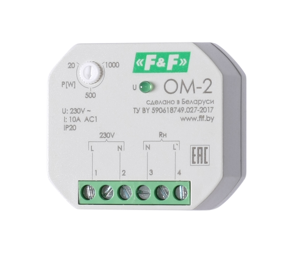 напряжение питания 230 В AC; диапазон контролируемой мощности 20...1000 Вт; контакт - 1NO (10 А).