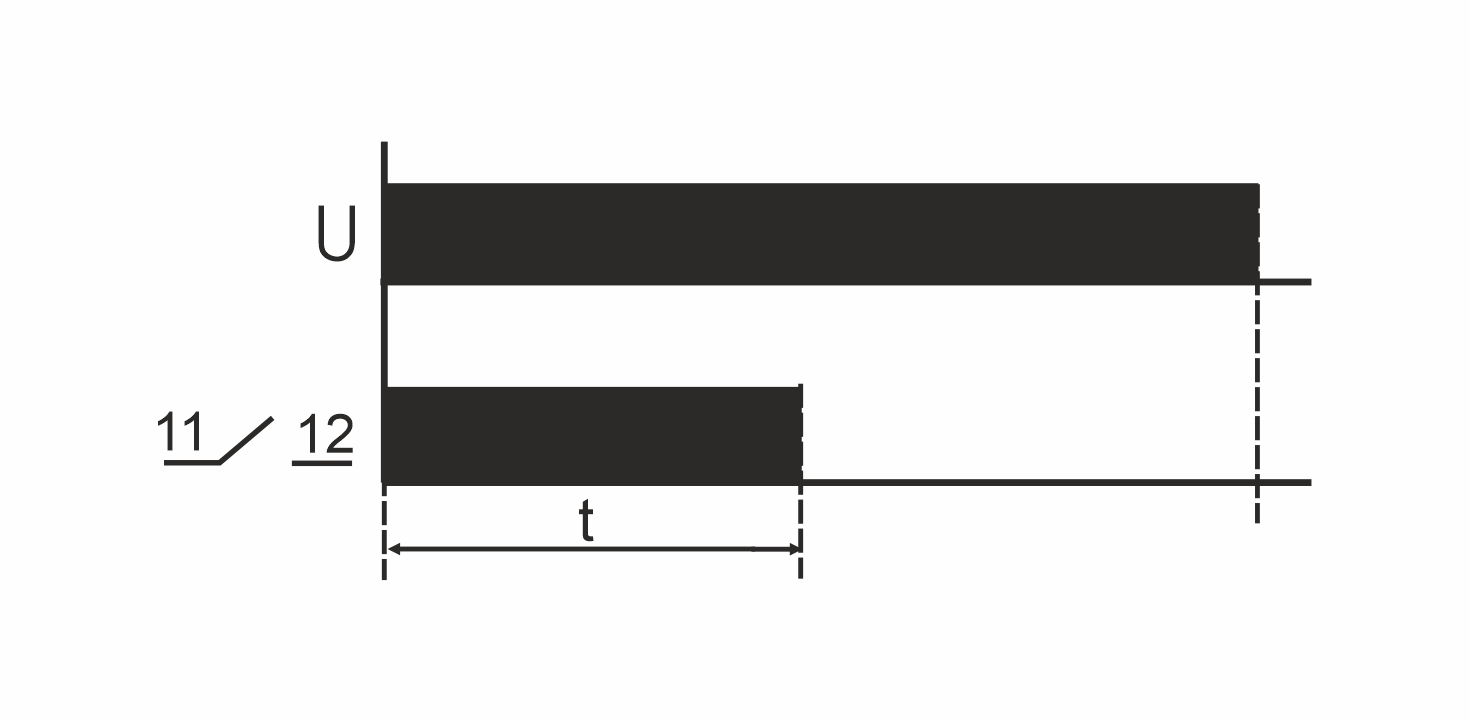 Принцип работы: При включении питания включается реле, замыкаются контакты 11-12. После отсчёта установленной выдержки времени контакты реле возвращаются в положение 11-10 и в таком положении остаются до отключения питания. Для повтора цикла работы необходимо отключение напряжения питания и подача его повторно.