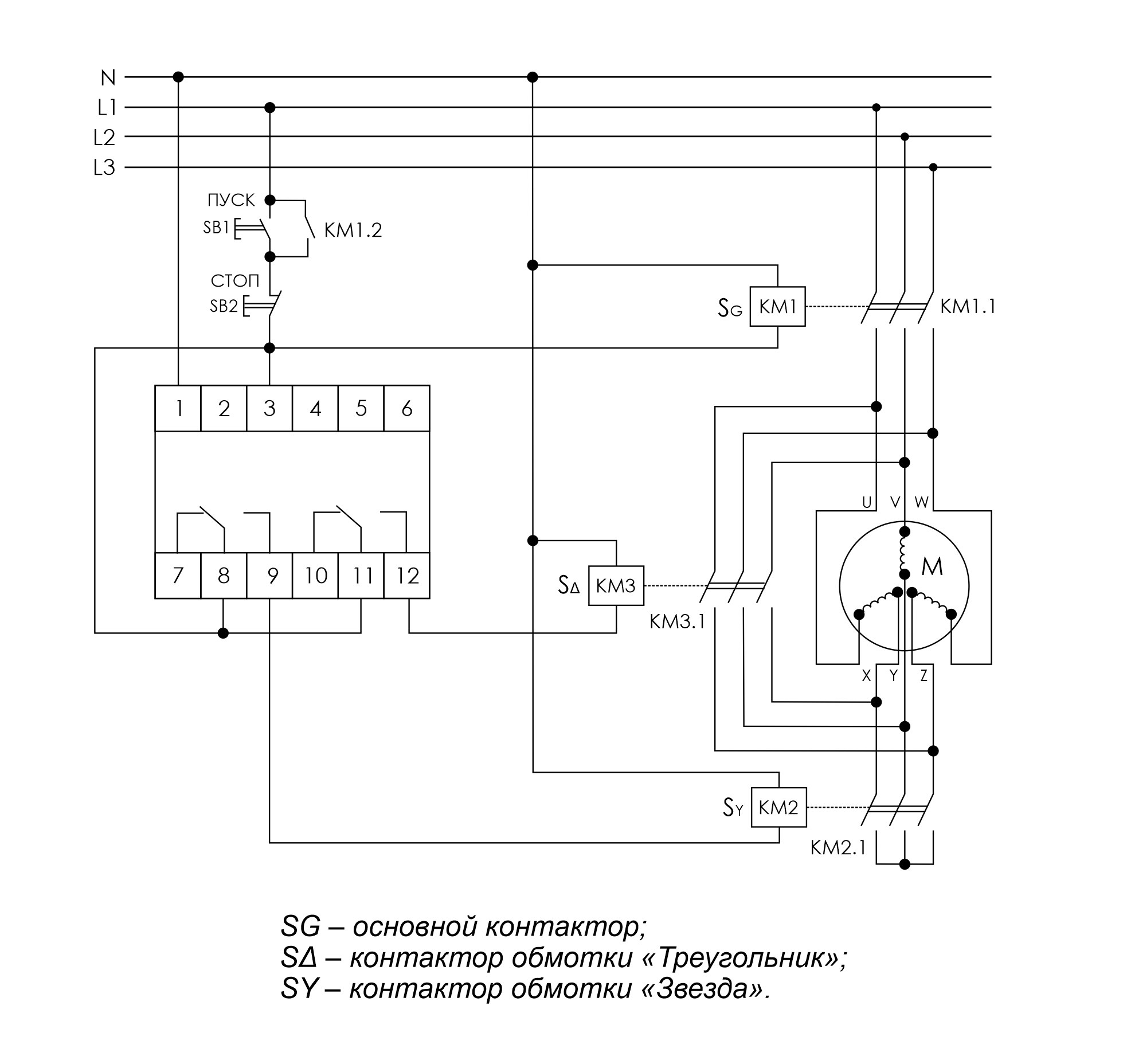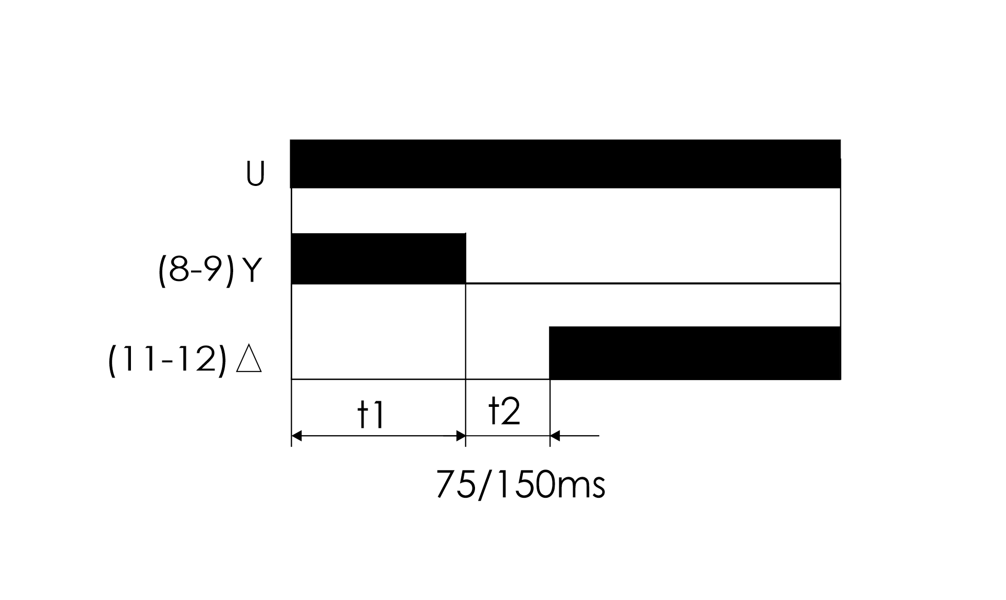 Принцип работы: Реле времени имеет 2 релейных выхода. Каждый управляет отдельным контактором. В момент пуска его первый выход включает контактор Sλ (замыкаются контакты 7-9) и обмотки электродвигателя подключаются по схеме «ЗВЕЗДА», что снижает пусковой ток в несколько раз. По окончании времени выхода двигателя на рабочий режим (время t1) наступает пауза (t2), когда оба контактора выключены, затем включается контактор SΔ (замыкаются контакты 10-12), включающий обмотки по схеме «ТРЕУГОЛЬНИК».