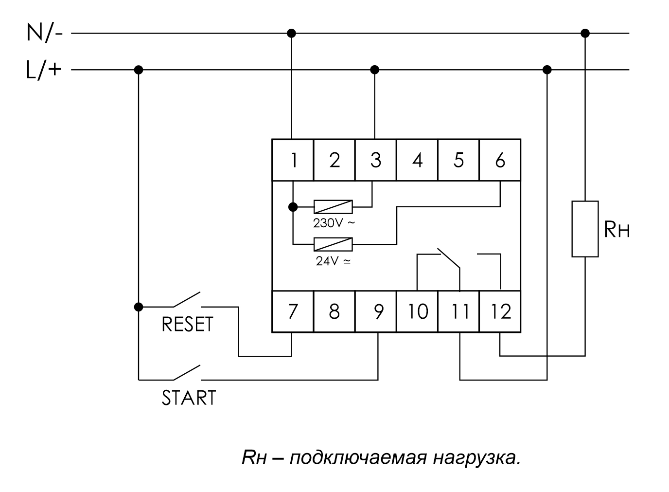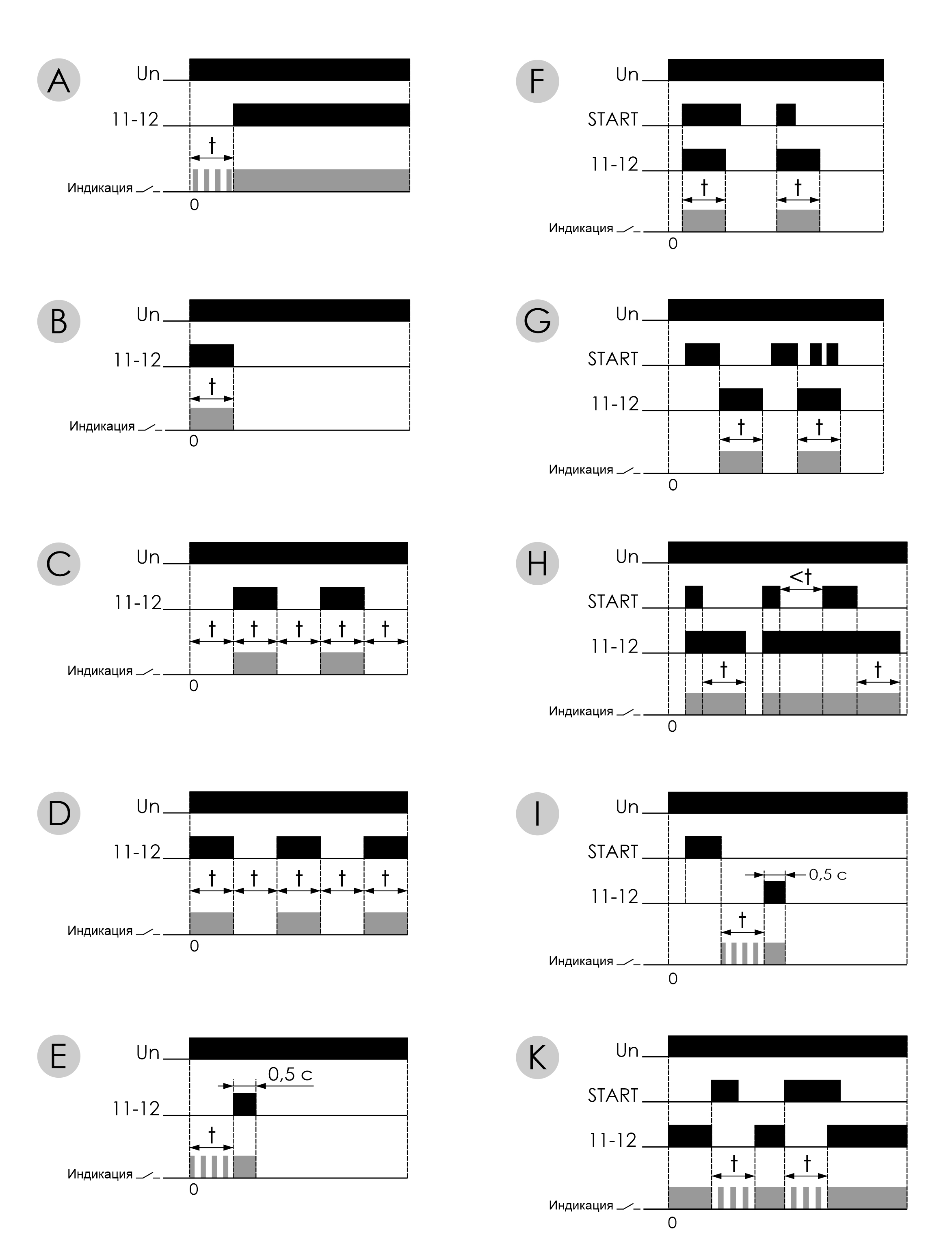 Функции: включение нагрузки на время t (А); задержка включения (В); циклическая работа с задержкой выключения (С); циклическая работа с задержкой включения (D); включение нагрузки на время 0,5 сек. (Е); формирователь импульса по переднему фронту управляющего сигнала (F); формирователь импульса по заднему фронту управляющего сигнала (G); задержка включения после сигнала START (H); формирователь импульса по заднему фронту управляющего сигнала (I); блокировка включения реле на время t (К).