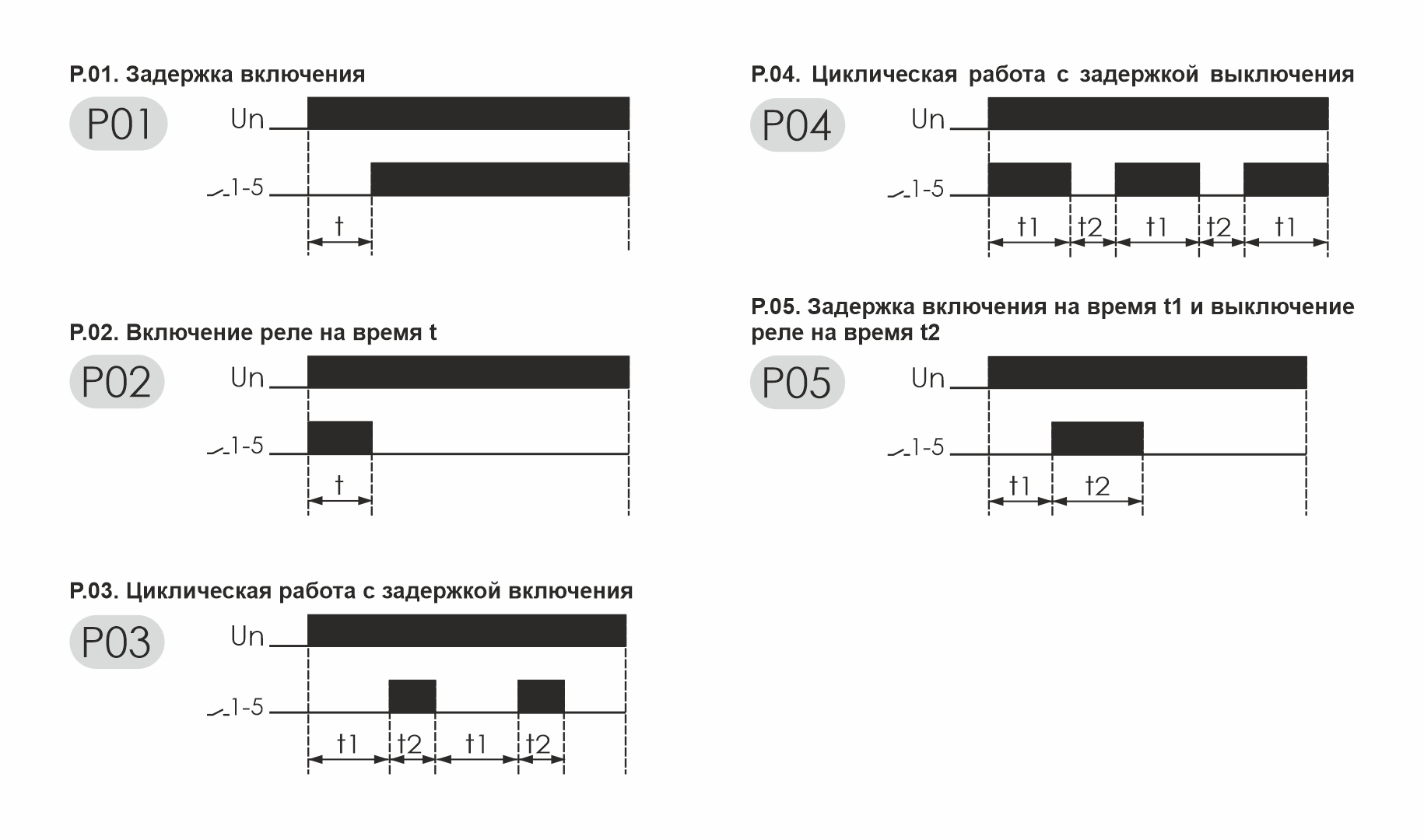 Функции: P01. Задержка включения; P02. Включение реле на время t; P03. Циклическая работа с задержкой включения; P04. Циклическая работа с задержкой выключения; P05. Задержка включения на время t1 и включение реле на время t2;
