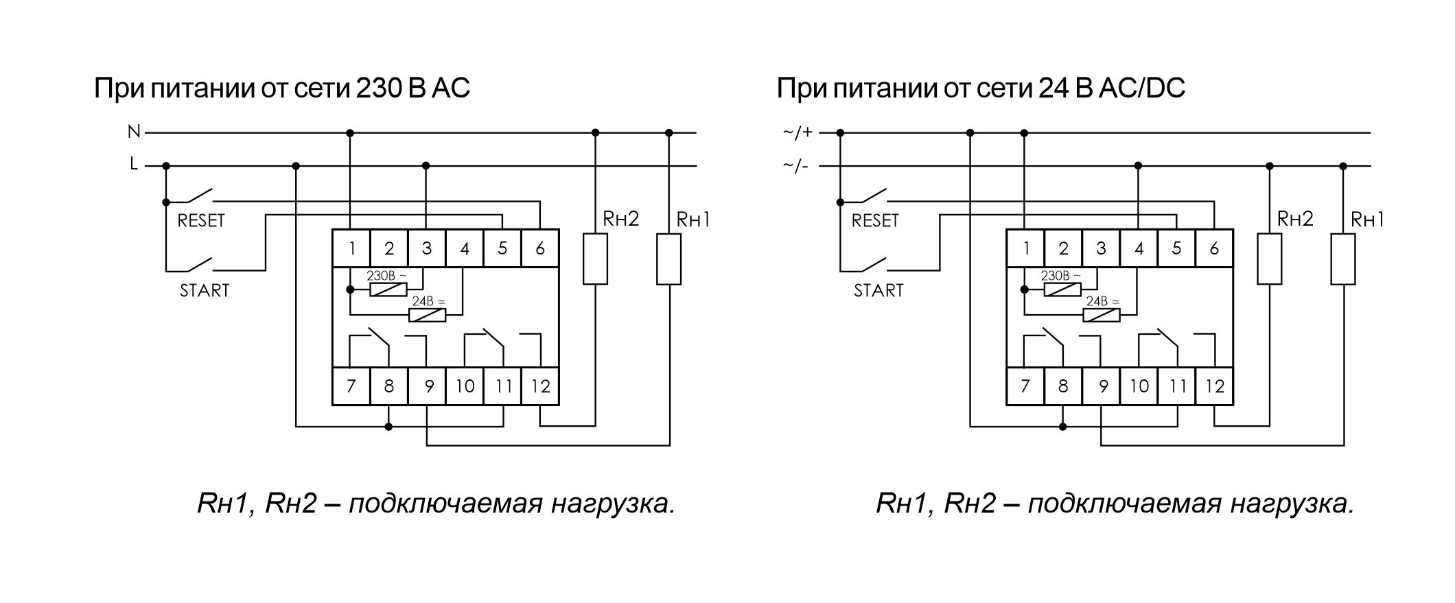 Функции: включение нагрузки на время t (А); задержка включения (В); циклическая работа с задержкой выключения (С); циклическая работа с задержкой включения (D); включение нагрузки на время 0,5 сек. (Е); формирователь импульса по переднему фронту управляющего сигнала (F); формирователь импульса по заднему фронту управляющего сигнала (G); задержка включения после сигнала START (H); формирователь импульса по заднему фронту управляющего сигнала (I); блокировка включения реле на время t (К).