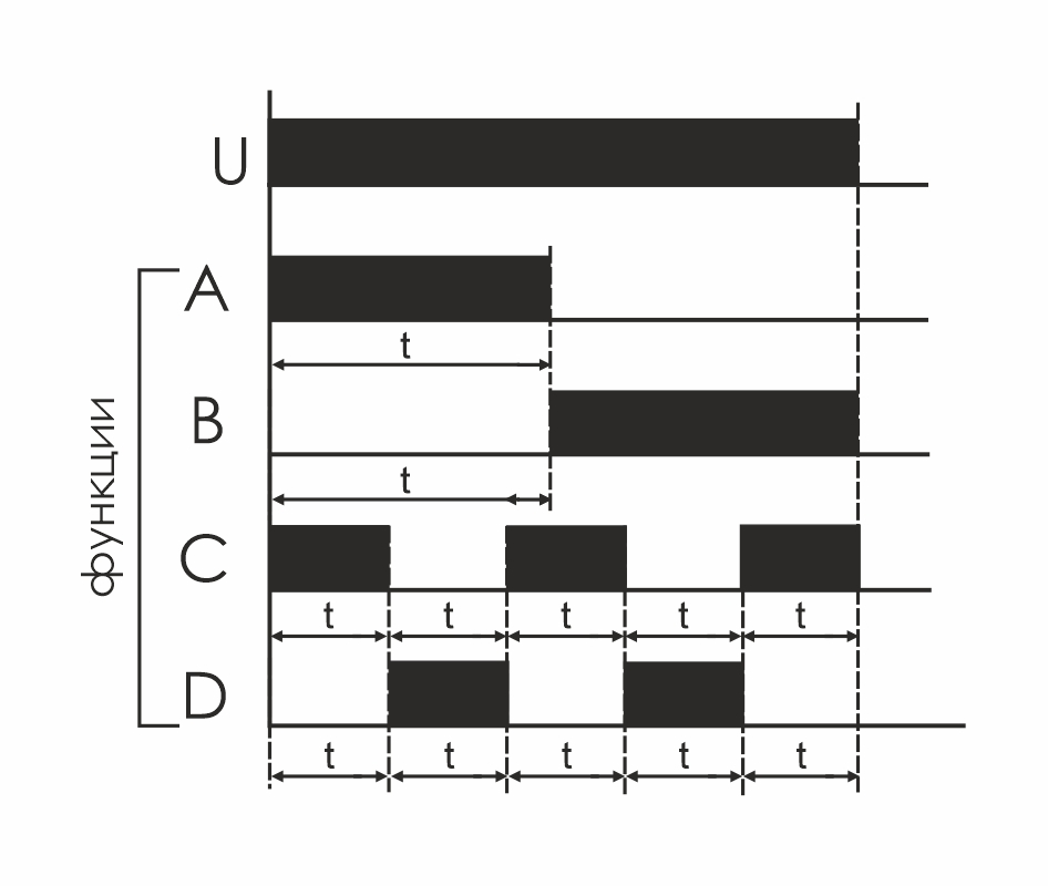 Функции: включение нагрузки на время t (A); задержка включения (В); циклическая работа с задержкой выключения (С); циклическая работа с задержкой включения (D).