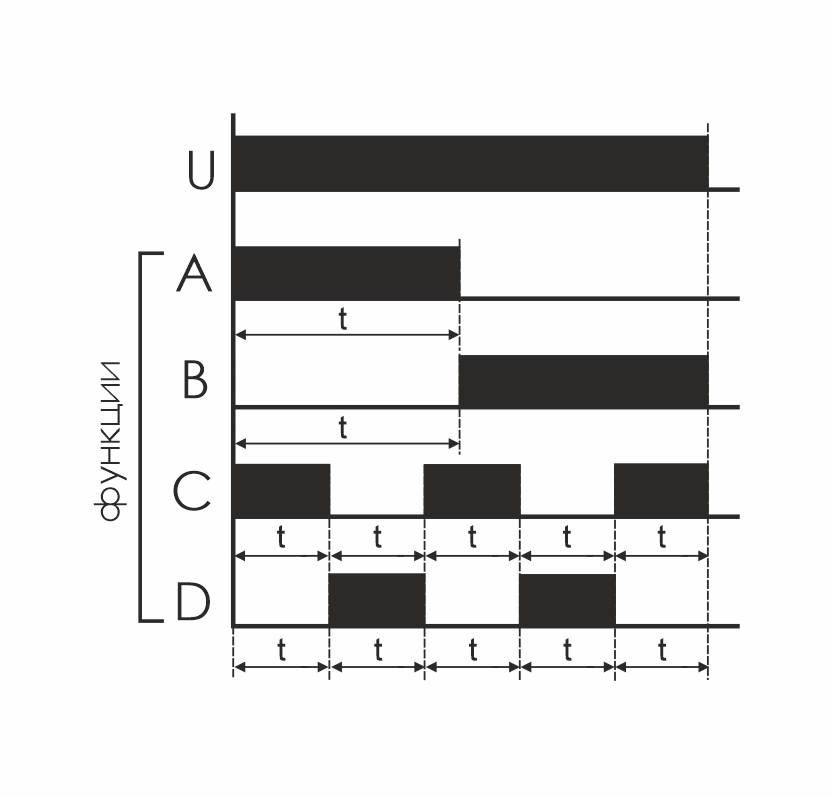 Функции: включение нагрузки на время t (A); задержка включения(В); циклическая работа с задержкой выключения (С); циклическая работа с задержкой включения (D).