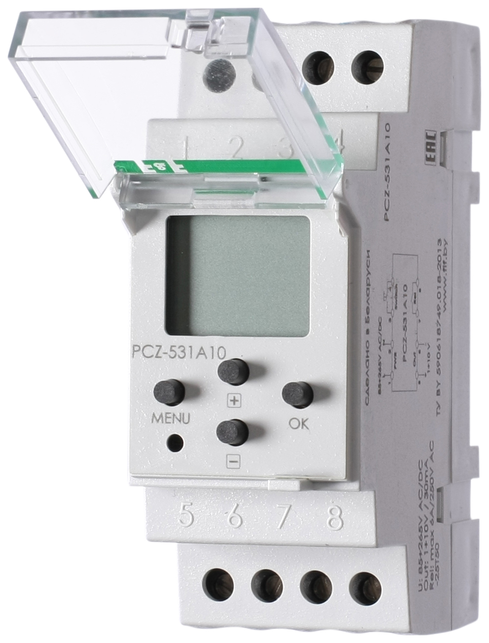 Принцип работы: Реле запрограммированное во временных циклах - ежедневном, еженедельном, по рабочим дням (Пн-Пт) или по выходным дням (Сб, Вс) циклически меняет уровень сигнала в выходной цепи, управляя тем самым, уровнем яркости освещения (в диапазоне 0-100%). Можно запрограммировать до 480 независимых шагов программы. Изделие оснащено входом управления, позволяющим дистанционно управлять им с помощью любой кнопки без фиксации и вспомогательным реле, которое активируется при запуске выходной цепи (установленный уровень яркости выше нуля).