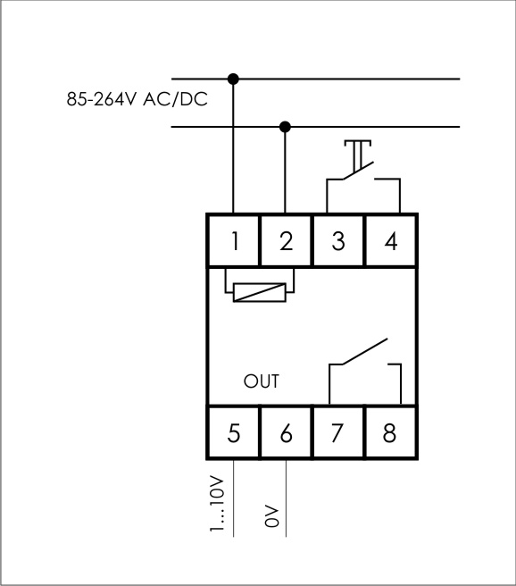 напряжение питания 85...265 В AC/DC; выход 0-10 В/30 мА; контакт - 1NO (6 А).