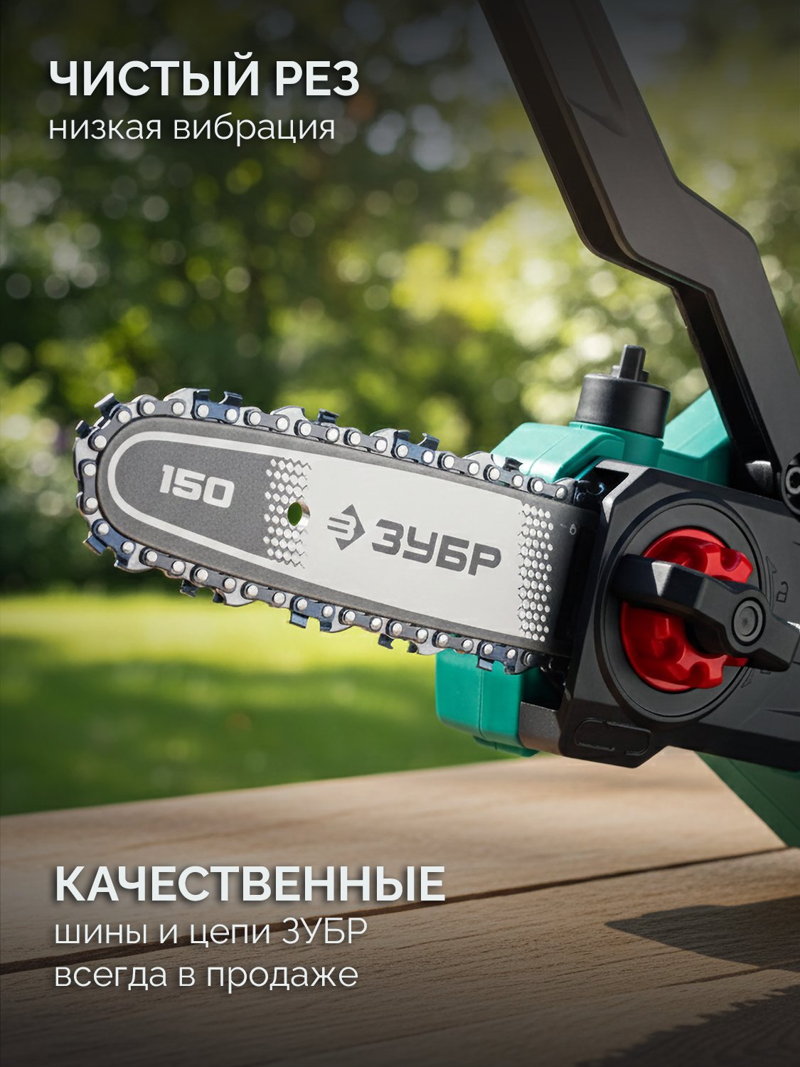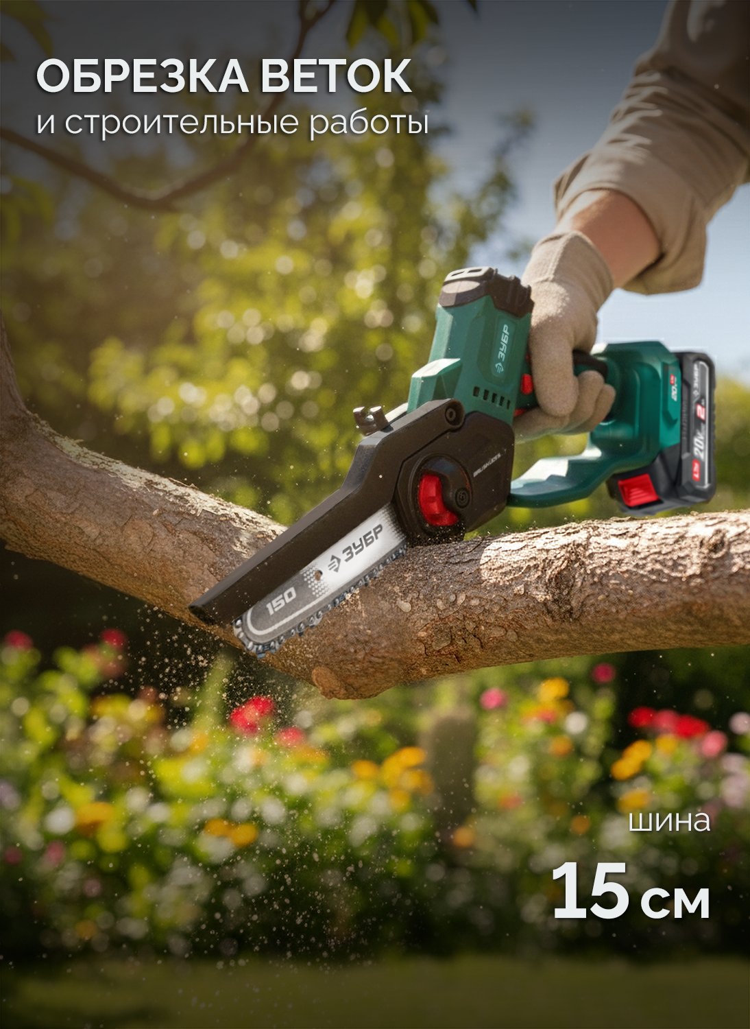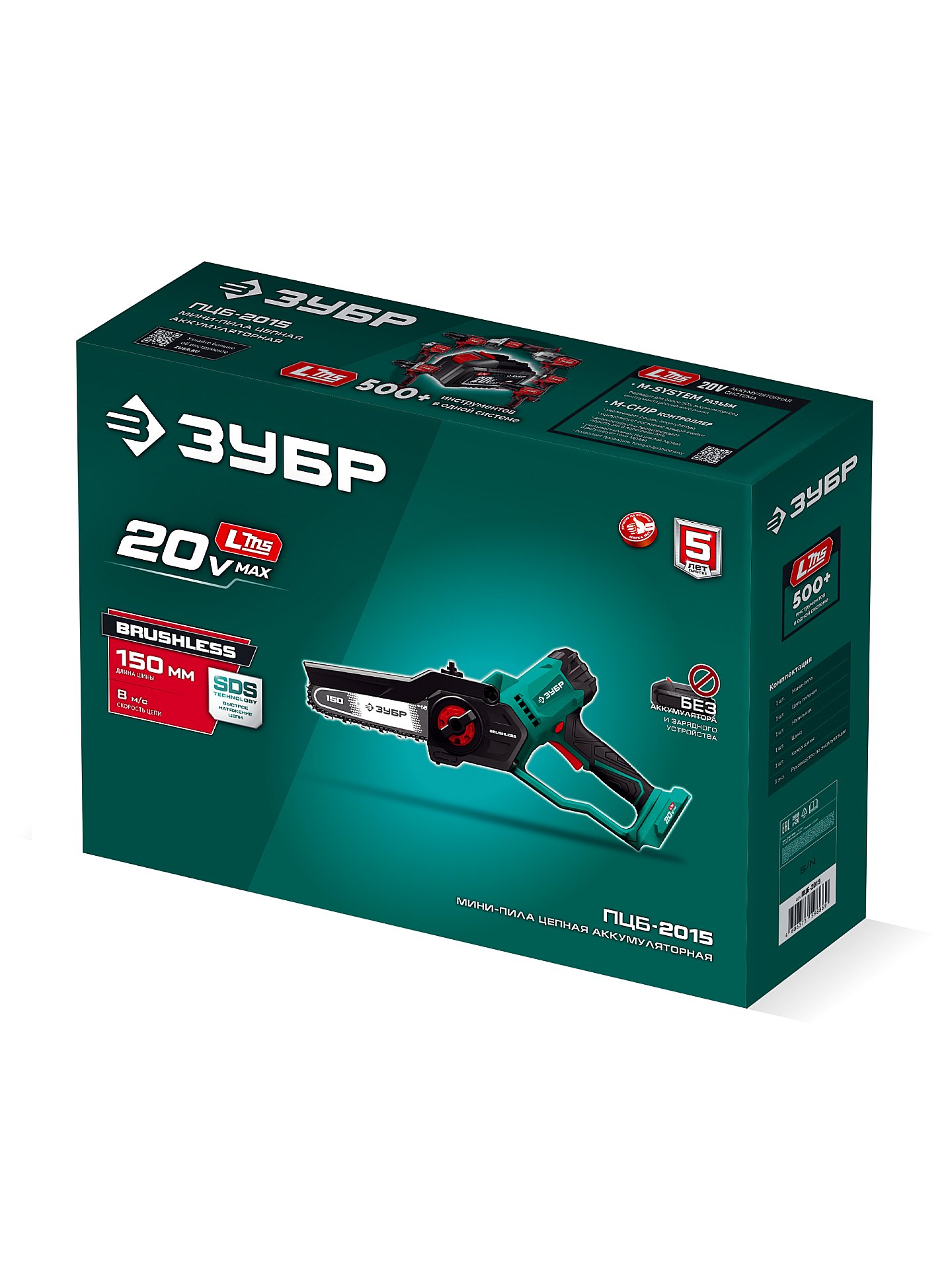 Мини-пила цепная аккумуляторная ЗУБР 20 В, 150 мм шина, без АКБ (LMS) ПЦБ-2015 — создана для работы в саду, обрезки веток и простых строительных работ.