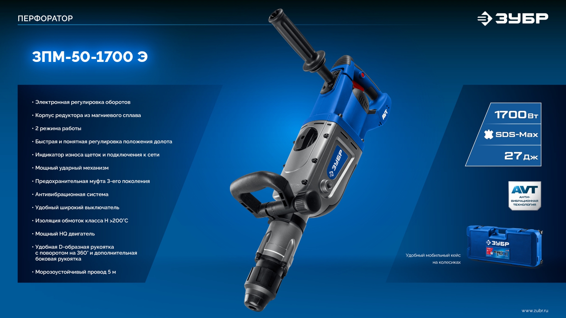 Перфоратор ЗУБР ЗПМ-50-1700 Э, предназначен для бурения отверстий и долбления в бетоне.