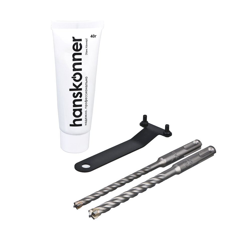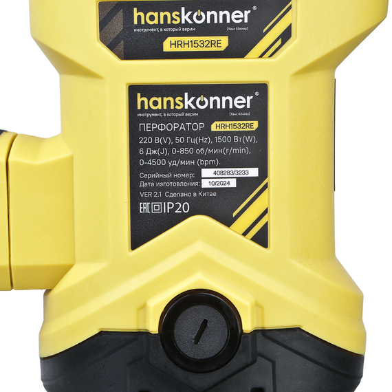 - К особенностям Hanskonner HRH1532RE стоит отнести возможность плавной регулировки оборотов силой нажатия на кнопку выключателя, что также не является типичным решением для перфораторов данной компоновки – опция позволяет аккуратно начинать бурение и использовать модель в качестве миксера с применением специальных наcадок.