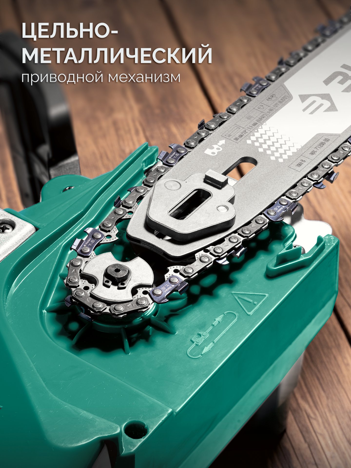 - Высокопроизводительная цепь с шагом 3/8 дюйма позволяет уверенно прорезать толстые ветки