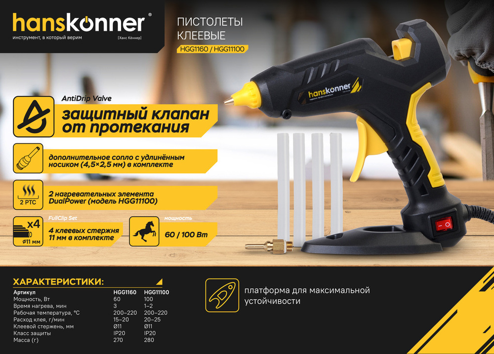 Клеевой пистолет со сменным соплом имеет эргономичную конструкцию, обеспечивающую комфорт во время работы. Он легкий и удобный в управлении, что делает его идеальным инструментом для профессиональных использования или домашних проектов.