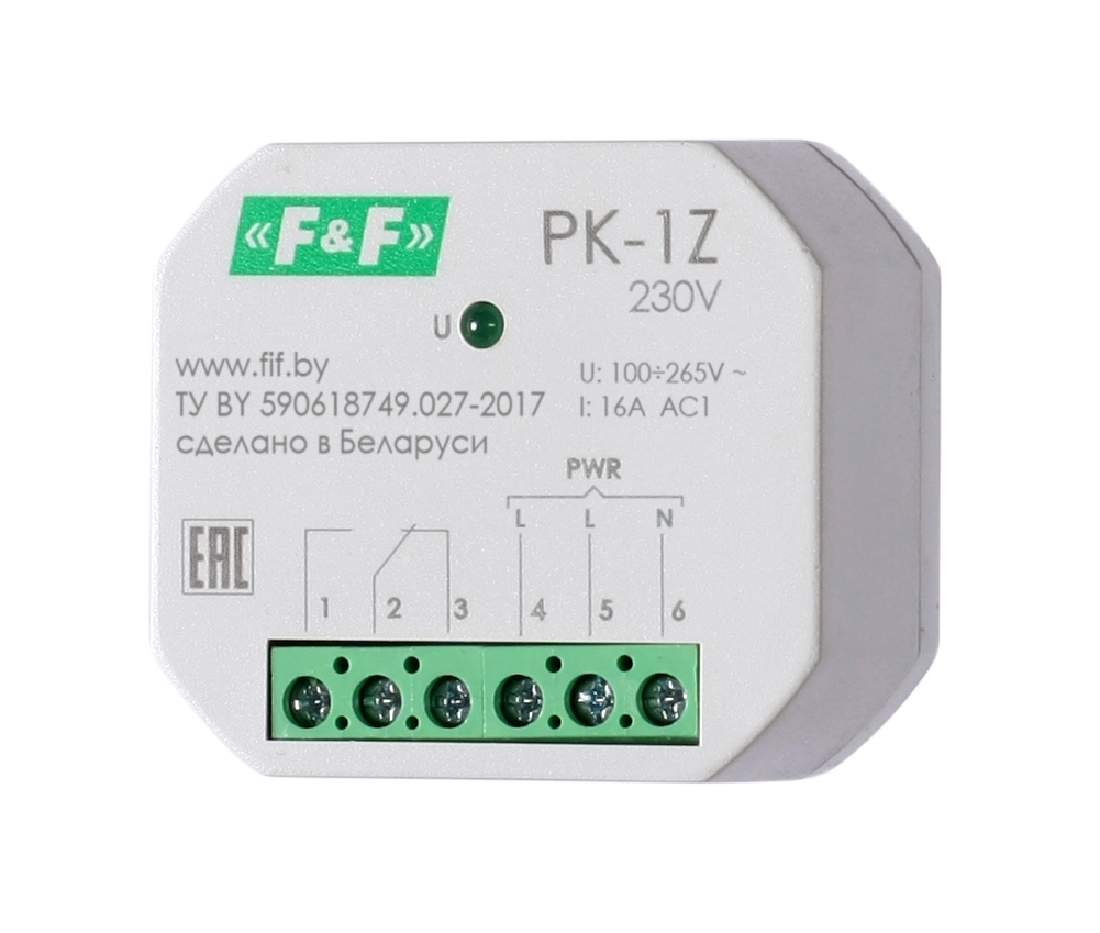 Монтаж в монтажную коробку. Для гальванической развязки между силовыми цепями и цепями управления, дистанционного включения нагрузки путем подачи управляющего напряжения на вход реле, а также использования в качестве промежуточных реле. Переключение контактов реле осуществляется подачей управляющего напряжения на контакты 5-6, при этом на лицевой панели загорается индикатор включения реле. Особенности: напряжение питания - 100...265 В AC/DC; максимальный ток нагрузки - 2x16 А; контакт - 2NO.