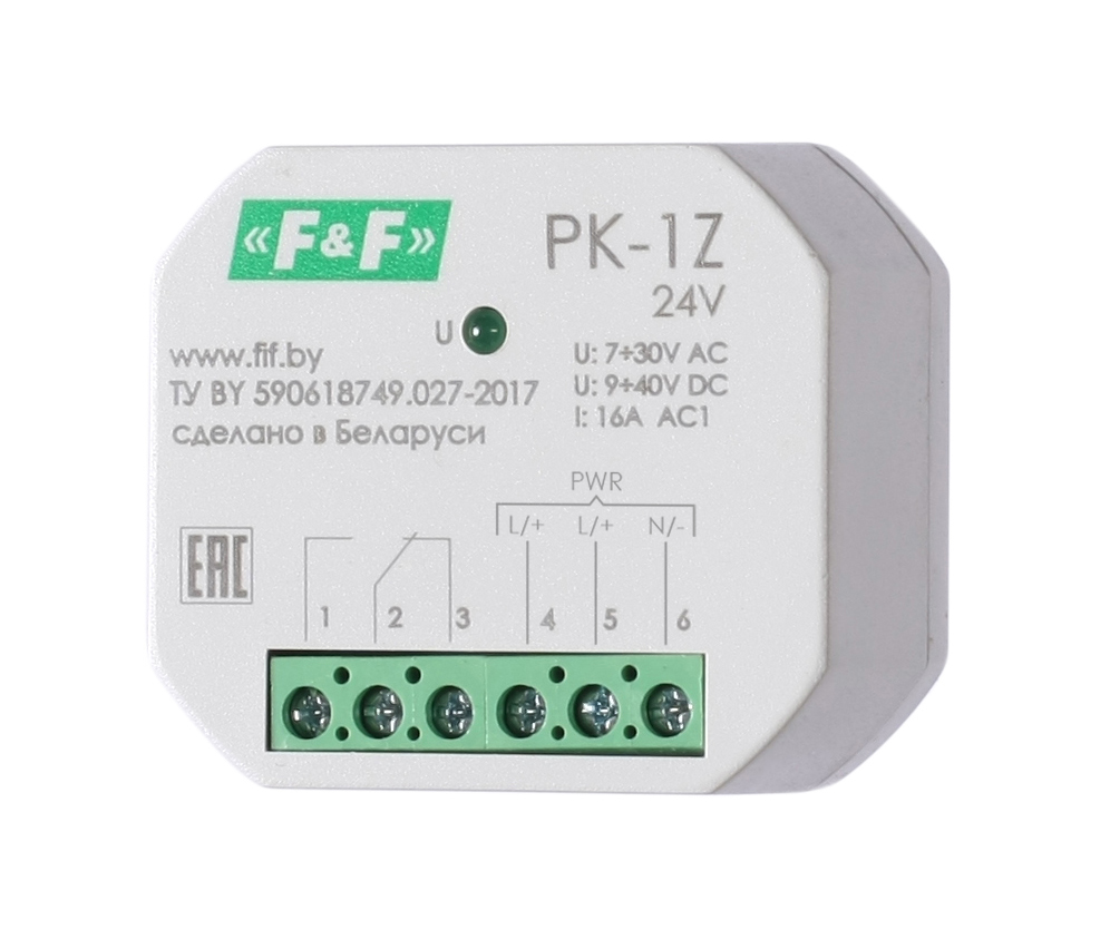Монтаж в монтажную коробку. Для гальванической развязки между силовыми цепями и цепями управления, дистанционного включения нагрузки путем подачи управляющего напряжения на вход реле, а также использования в качестве промежуточных реле. Переключение контактов реле осуществляется подачей управляющего напряжения на контакты 5-6, при этом на лицевой панели загорается индикатор включения реле.