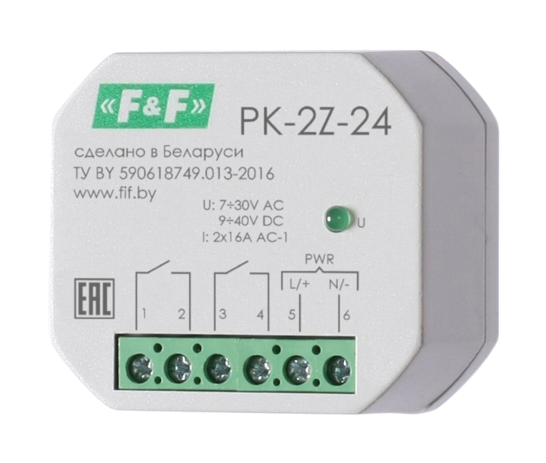 Особенности: напряжение питания - 7...30 В AC; 9...40 B DC; максимальный ток нагрузки - 2x16 А; контакт - 2NO.