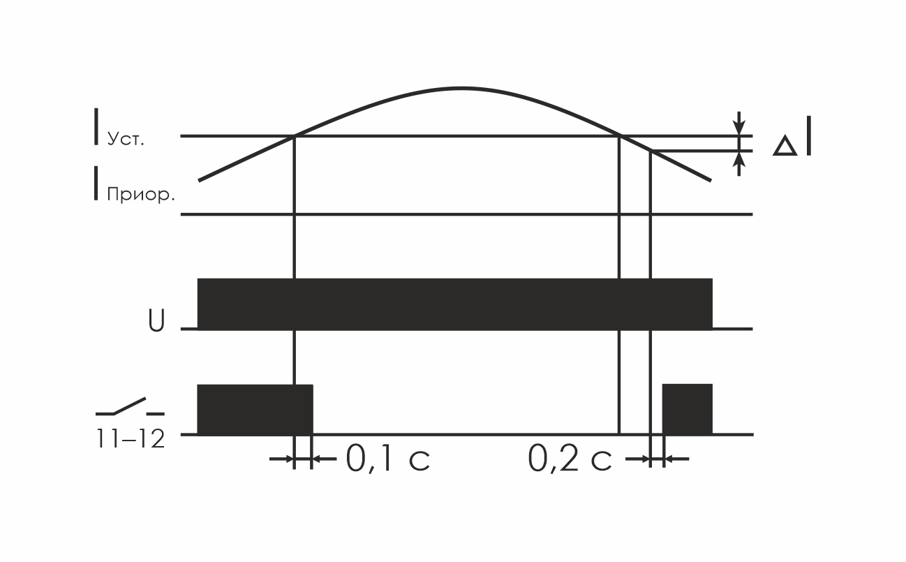 Монтаж на DIN-рейку. Для отключения неприоритетной нагрузки при превышении установленного значения потребляемого тока, а потребители приоритетной цепи остаются подключенными к питающей сети. Потенциометром на передней панели изделия устанавливается величина тока, при превышении которой отключается неприоритетная нагрузка. Если значение тока в приоритетной цепи не превышает установленное значение, контакты реле 11-12 замкнуты и неприоритетная нагрузка подключена к сети питания. Если измеренное значение тока превысит установленное пороговое значение, контакты 11-12 размыкаются и неприоритетная нагрузка отключается. При снижении величины потребляемого тока в приоритетной цепи реле автоматически подключает неприоритетную цепь (нагрузку) к сети питания. Применяется в случаях, когда одновременная работа всех потребителей приводит к перегрузке питающей сети (ввод электропитания рассчитан на меньшую мощность, чем мощность потребителей, лимит потребления электроэнергии и пр.).