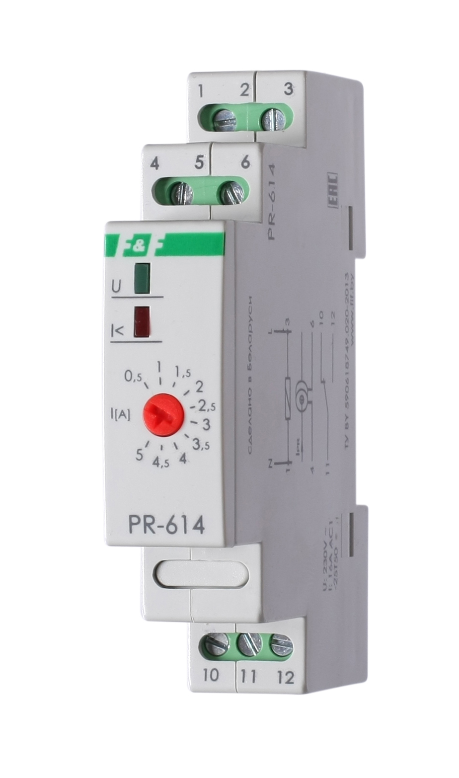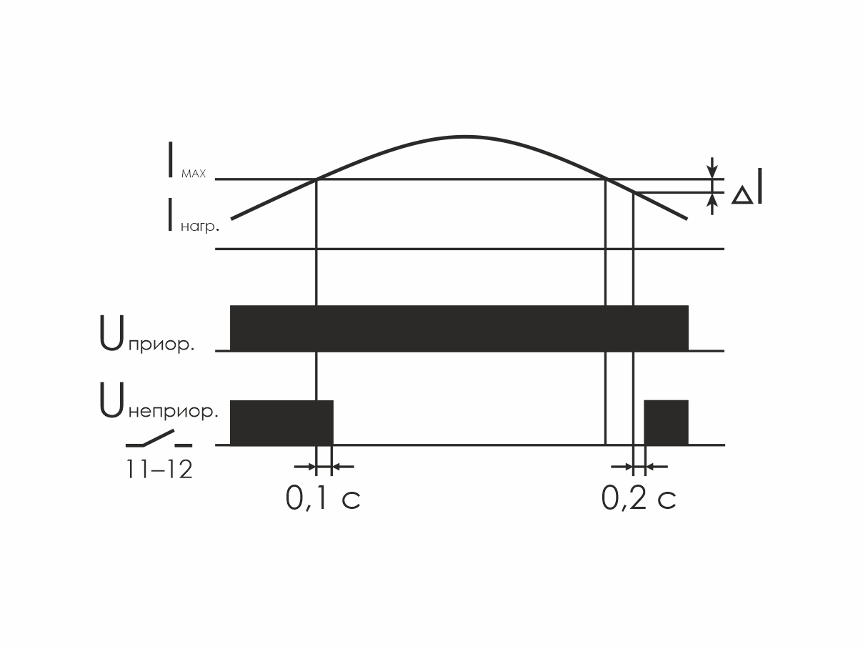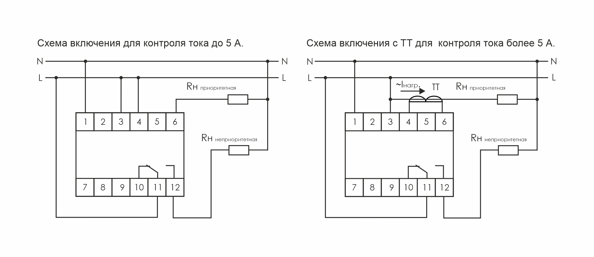 Монтаж на DIN-рейку. Для отключения неприоритетной нагрузки при превышении установленного значения потребляемого тока, а потребители приоритетной цепи остаются подключенными к питающей сети. Потенциометром на передней панели изделия устанавливается величина тока, при превышении которой отключается неприоритетная нагрузка. Если значение тока в приоритетной цепи не превышает установленное значение, контакты реле 11-12 замкнуты и неприоритетная нагрузка подключена к сети питания. Если измеренное значение тока превысит установленное пороговое значение, контакты 11-12 размыкаются и неприоритетная нагрузка отключается. При снижении величины потребляемого тока в приоритетной цепи реле автоматически подключает неприоритетную цепь (нагрузку) к сети питания. Применяется в случаях, когда одновременная работа всех потребителей приводит к перегрузке питающей сети (ввод электропитания рассчитан на меньшую мощность, чем мощность потребителей, лимит потребления электроэнергии и пр.).