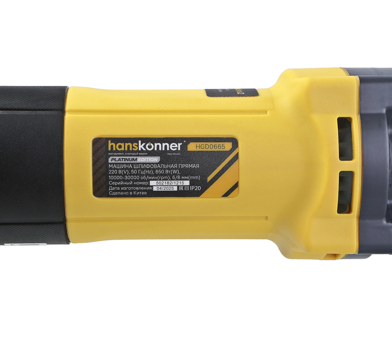 Прямая шлифовальная машина Hanskonner HGD0665 — маневренное универсальное устройство для широкого спектра работ: резка, сверление, полирование, гравирование, шлифование, фрезерование различных материалов: металл, дерево, камень, стекло, пластмасса и т.д. Данная модель оснащена настройкой оборотов VariableGrades с 6 позициями выбора скорости, от 10000 до 30000 об/мин, для разных видов работ.