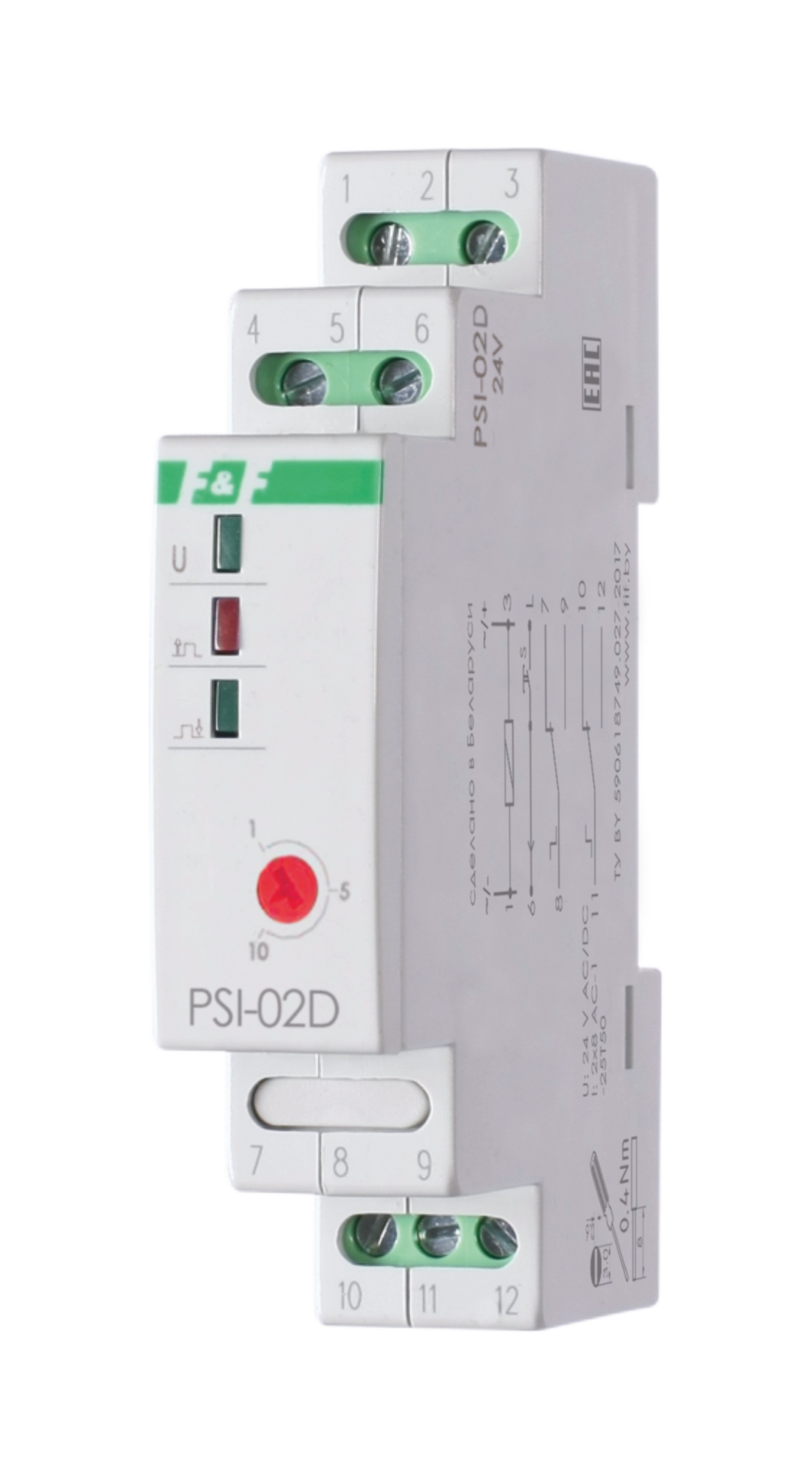 Монтаж на DIN-рейку. Для преобразования непрерывного электрического напряжения в одиночные импульсы, управляющие исполнительными устройствами различных систем автоматики. Реле, после принятия управляющего сигнала на входе Ust (по фронту), генерирует импульс на выходе 12 (контакт 11-12 замыкается на установленное время t). После снятия управляющего сигнала (по спаду) реле генерирует другой импульс на выходе 9 (контакт 8-9 замыкается на установленное время t). Применяется в системах автоматики, АВР, «Умный дом» и др.