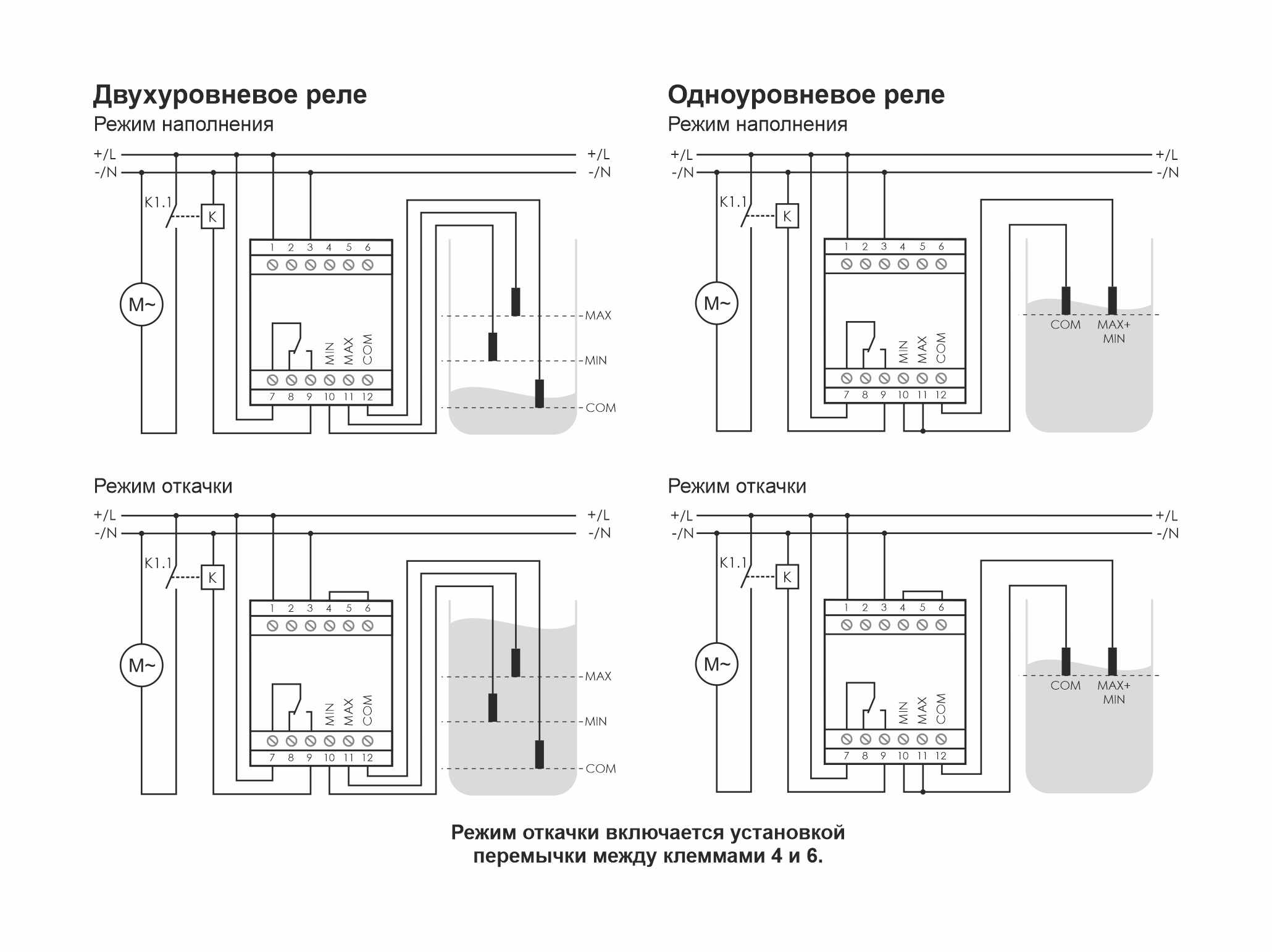 Монтаж на DIN-рейку. Предназначено для контроля и поддержания заданного уровня токопроводящих жидкостей в резервуарах, бассейнах, водонапорных башнях и т.п. и управления электродвигателями насосных установок. При включении питания реле входит в рабочий режим через 2 секунды. Клеммы подключения датчиков гальванически изолированы от цепей питания. В зависимости от жидкости, в которую помещается датчик, изменяется чувствительность входных каскадов автомата. Для нормальной работы, после монтажа, следует отрегулировать чувствительность при помощи регуляторов на лицевой панели («150» - увеличение, «5» - уменьшение). Возможно удлинение провода подключения датчиков до 50 метров.