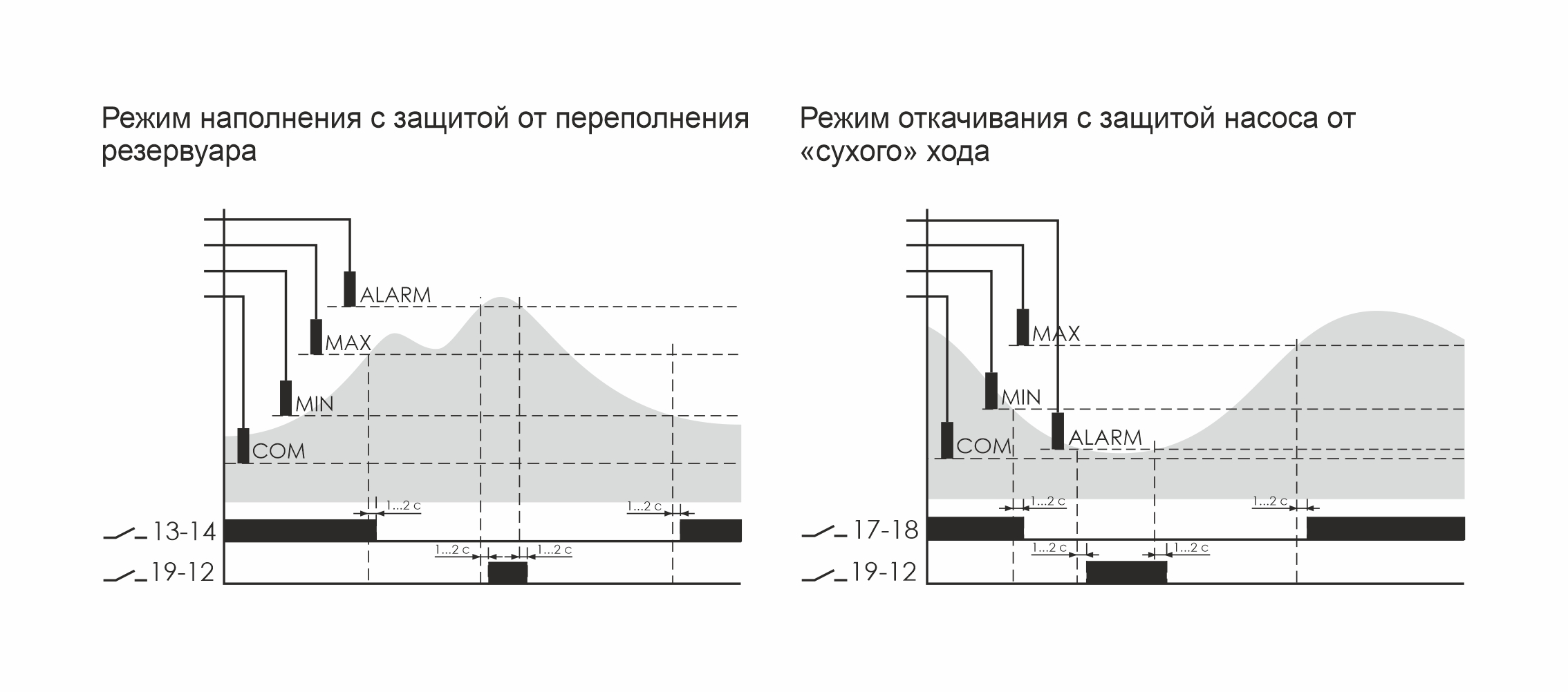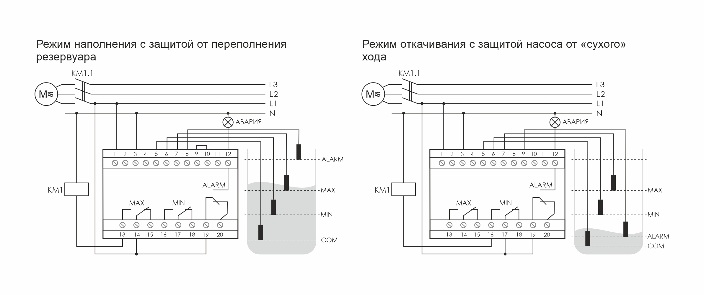 Монтаж на DIN-рейку. Предназначено для контроля и поддержания заданного уровня токопроводящих жидкостей в резервуарах, бассейнах, водонапорных башнях и т.п. и управления электродвигателями насосных установок. При включении питания реле входит в рабочий режим через 2 секунды. Клеммы подключения датчиков гальванически изолированы от цепей питания. В зависимости от жидкости, в которую помещается датчик, изменяется чувствительность входных каскадов автомата. Для нормальной работы, после монтажа, следует отрегулировать чувствительность при помощи регуляторов на лицевой панели («100» - увеличение, «1» - уменьшение). Возможно удлинение провода подключения датчиков до 50 метров. Особенности: максимальный ток нагрузки - 3х16 А; контакты - 3NO/NC.