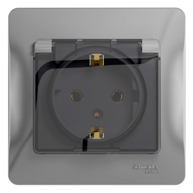 Розетка Systeme Electric (ранее Schneider Electric) серии Glossa (в сборе, цвет алюминий) одинарная с заземлением, шторками и крышкой подходит для сетей 250 В, на ток 16 А. - Заземляющий контакт обеспечивает дополнительную защиту от удара электрическим током. При наличии заземления электрический потенциал уходит в землю, защищая человека. - Выполнен из материала PС+ASA, стойкого к УФ-излучению и появлению царапин. - Эргономичные клеммы розеток расположены в один ряд.