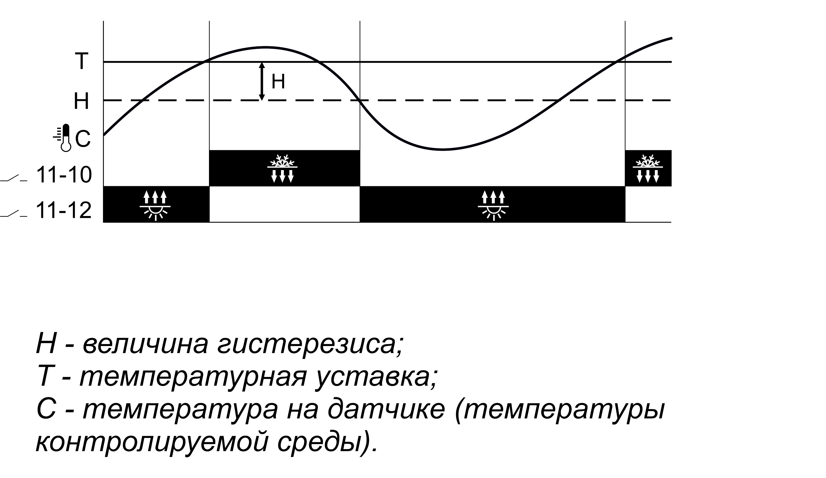 Монтаж на DIN-рейку. Для контроля и поддержания заданного температурного режима путем включения / выключения нагревательной/охлаждающей установки по сигналам выносного датчика температуры. В зависимости от выполняемой задачи исполнительное устройство (нагреватель или охладитель) подключаются к определённым контактам выходного реле. При достижении заданной на панели прибора температуры происходит выключение нагревателя (охладителя). Например, в случае нагрева при снижении температуры в контролируемой зоне ниже заданной контакты исполнительного реле замыкаются включается нагреватель. По достижении заданной температуры контакты исполнительного реле размыкаются и нагреватель отключается. При понижении температуры на величину установленного гистерезиса контакты реле замыкаются, и нагреватель включается снова. Для случая охлаждения принцип работы аналогичен.