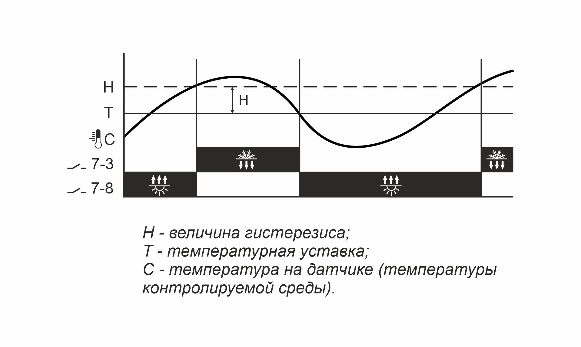 Монтаж на DIN-рейку. Для контроля и поддержания заданного температурного режима путем включения / выключения нагревательной/охлаждающей установки по сигналам выносного датчика температуры. В зависимости от выполняемой задачи исполнительное устройство (нагреватель или охладитель) подключаются к определённым контактам выходного реле. При достижении заданной на панели прибора температуры происходит выключение нагревателя (охладителя). Например, в случае нагрева при снижении температуры в контролируемой зоне ниже заданной контакты исполнительного реле замыкаются включается нагреватель. По достижении заданной температуры контакты исполнительного реле размыкаются и нагреватель отключается. При понижении температуры на величину установленного гистерезиса контакты реле замыкаются, и нагреватель включается снова. Для случая охлаждения принцип работы аналогичен.