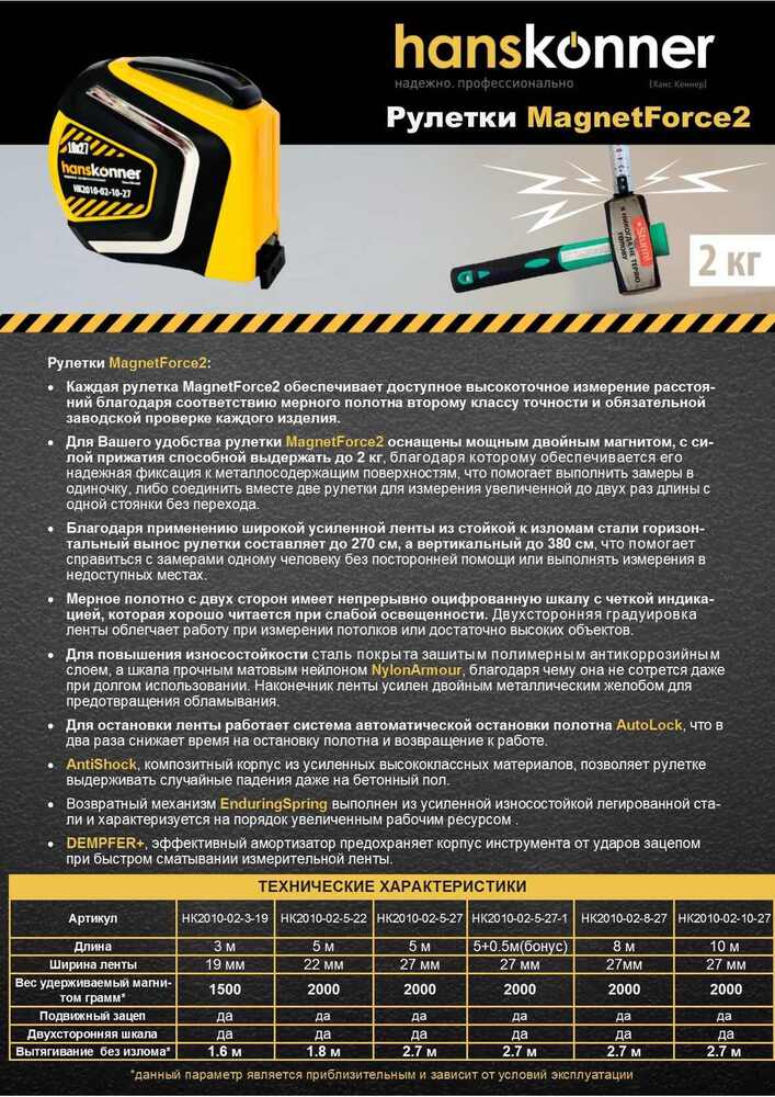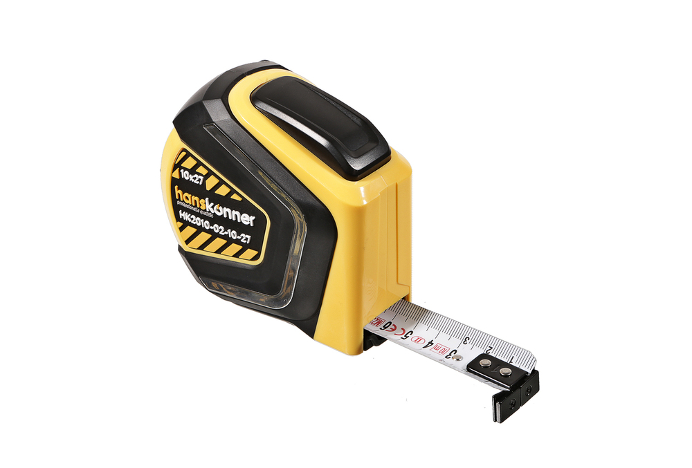 Рулетка 10x27мм, автостоп, двухстор., нейлон, супермощный магнит, Hanskonner HK2010-02-10-27 — усовершенствованная модель с увеличенной дальностью действия, благодаря которой разметочные работы выполняются быстро и точно.
