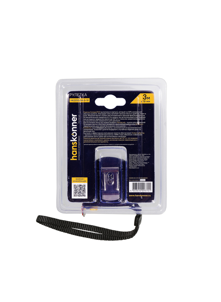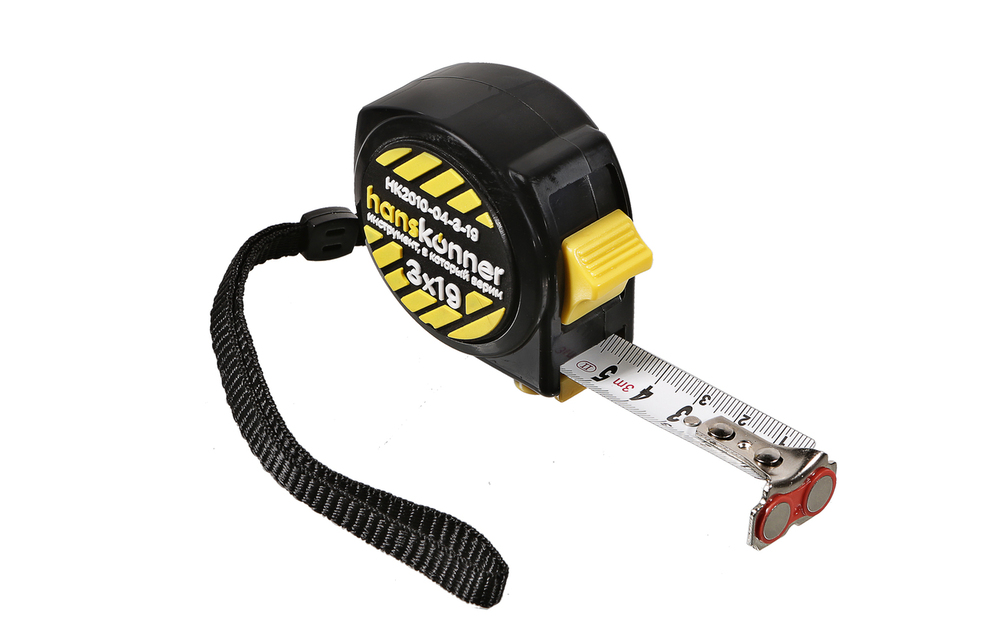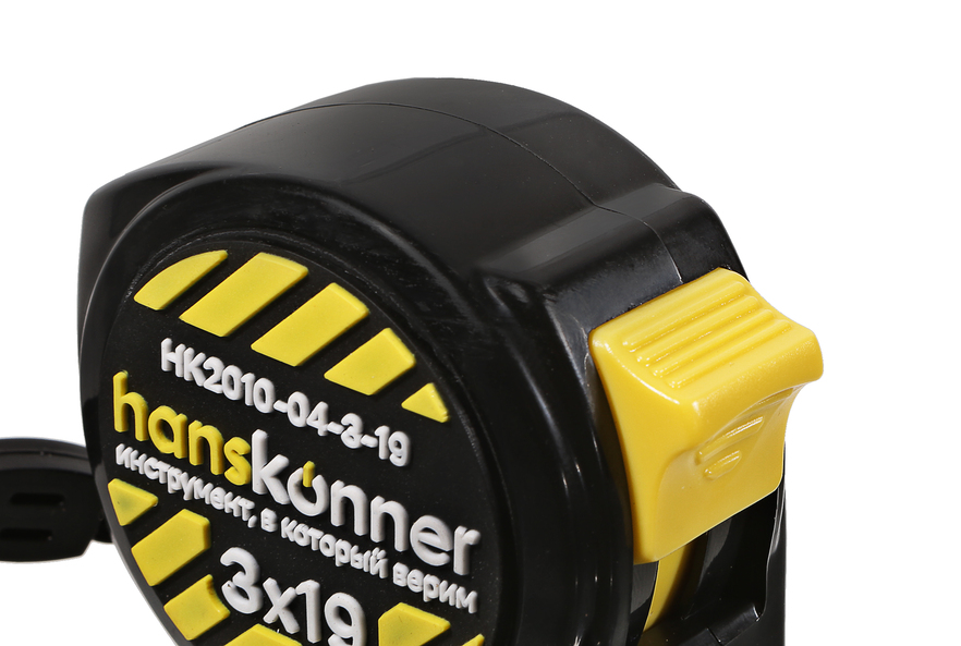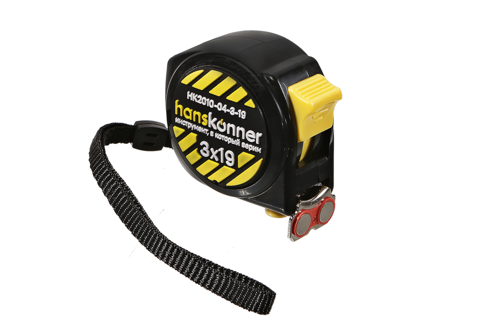 Рулетка 3x19мм, 2 стопа, компактн. корпус, 2 стопа, мощный магнит, Hanskonner HK2010-04-3-19 — выполнена в корпусе, который на 32% компактней обычных рулеток, благодаря чему занимает меньше места и удобней лежит в руке.