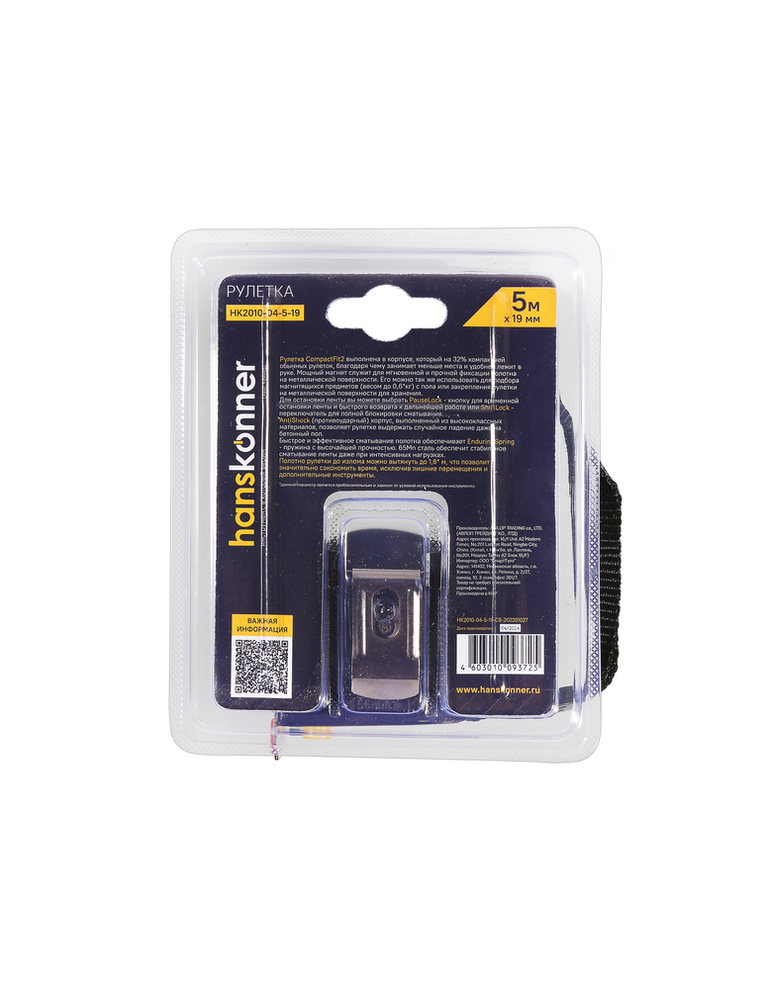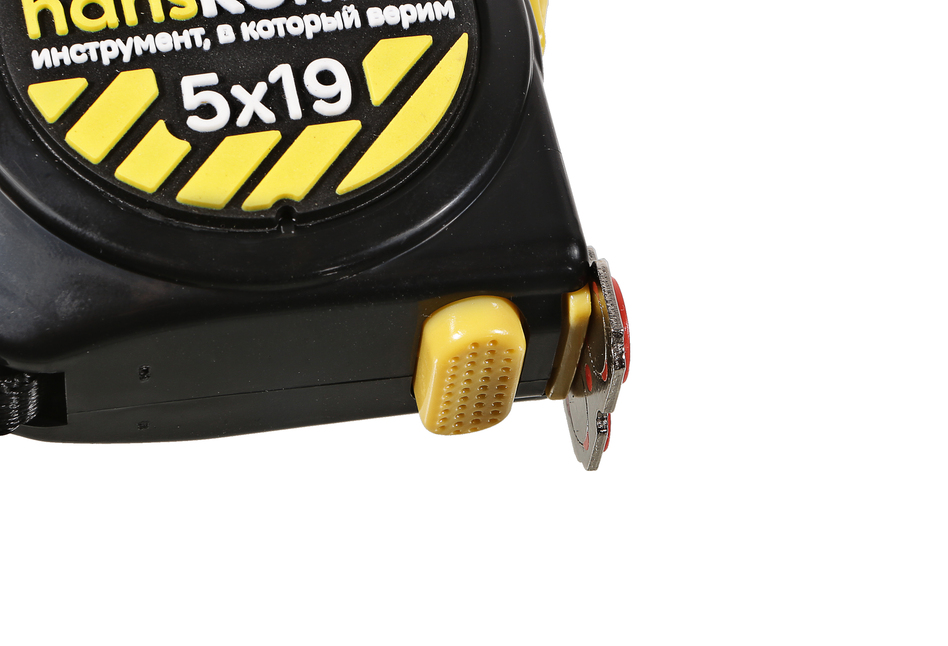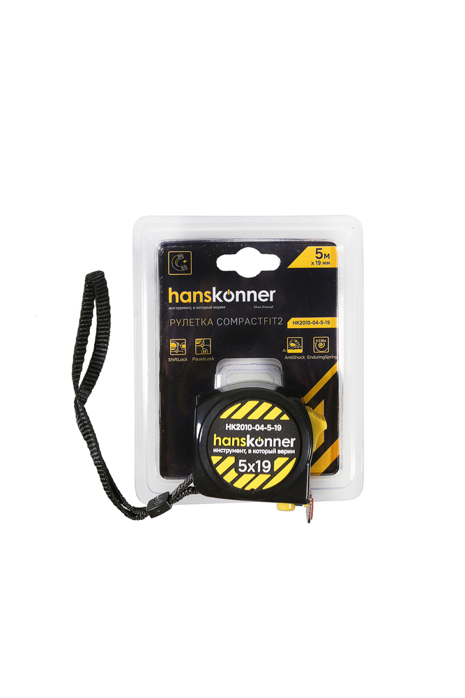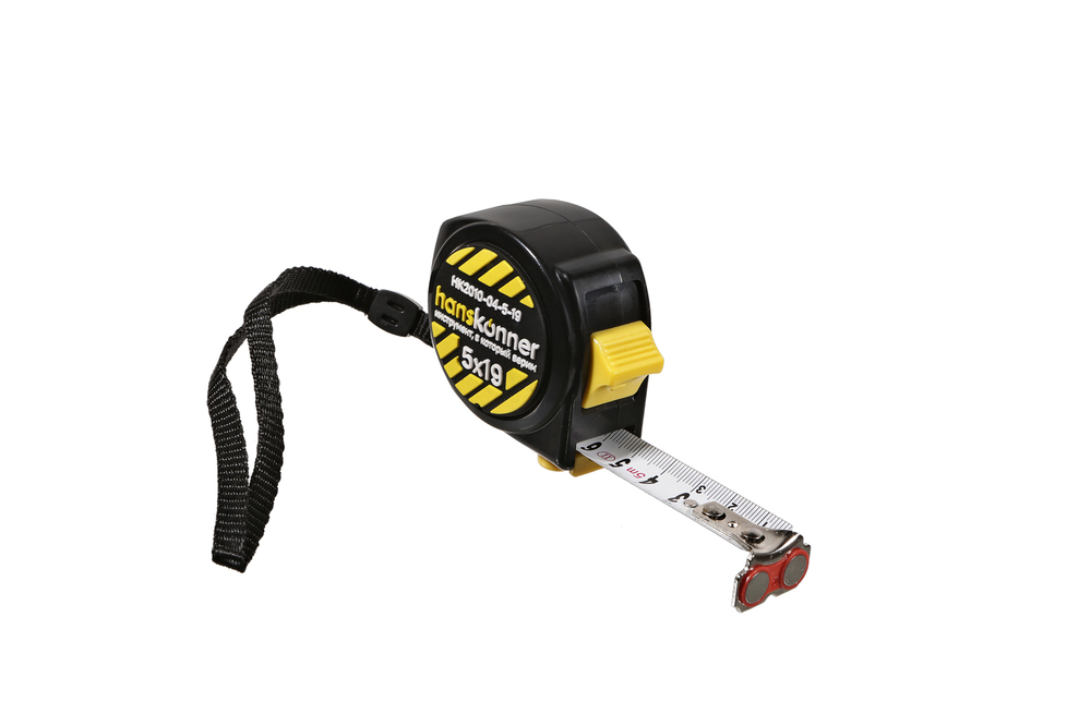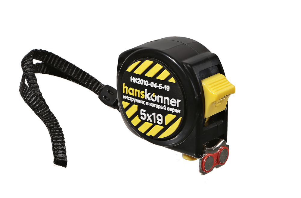 Рулетка 5x19мм, 2 стопа, компактн. корпус, 2 стопа, мощный магнит, Hanskonner HK2010-04-5-19 — выполнена в корпусе, который на 32% компактней обычных рулеток, благодаря чему занимает меньше места и удобней лежит в руке.