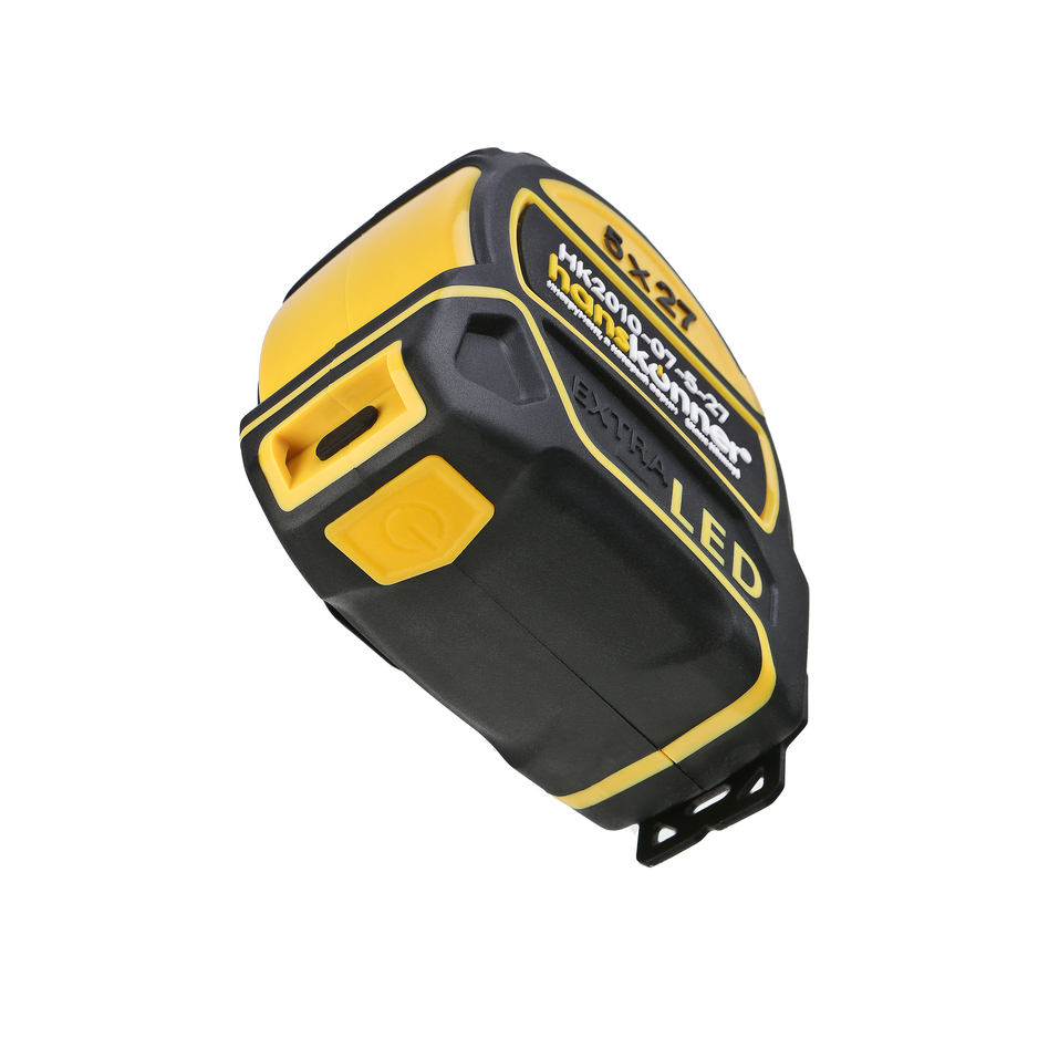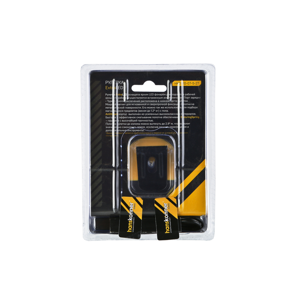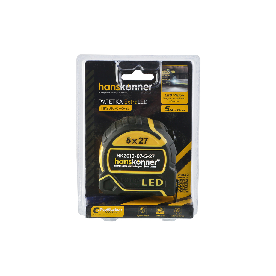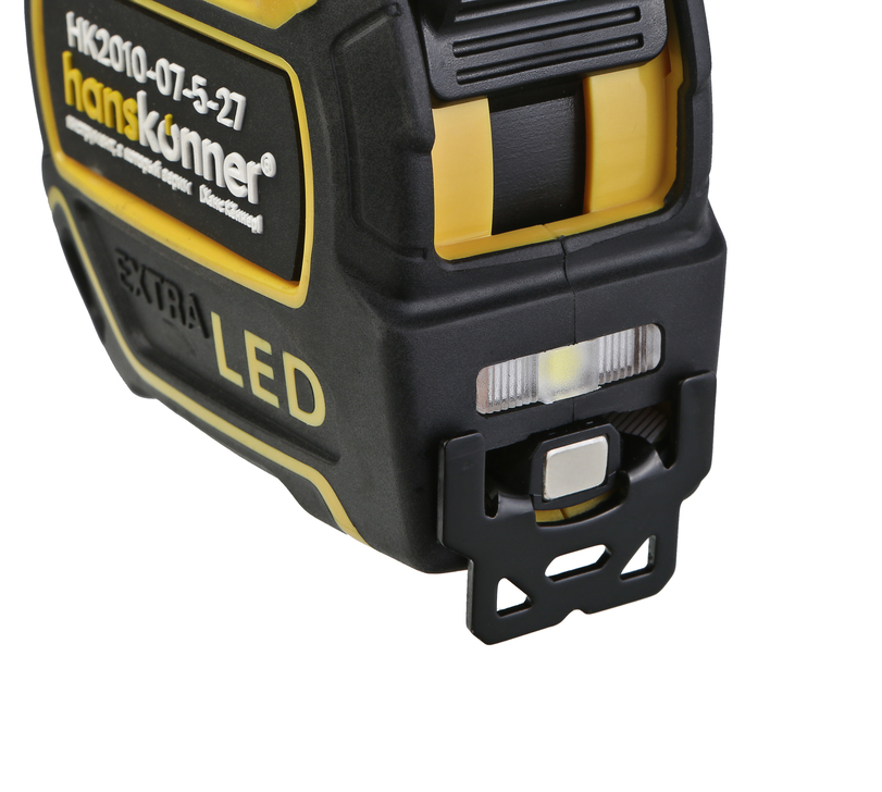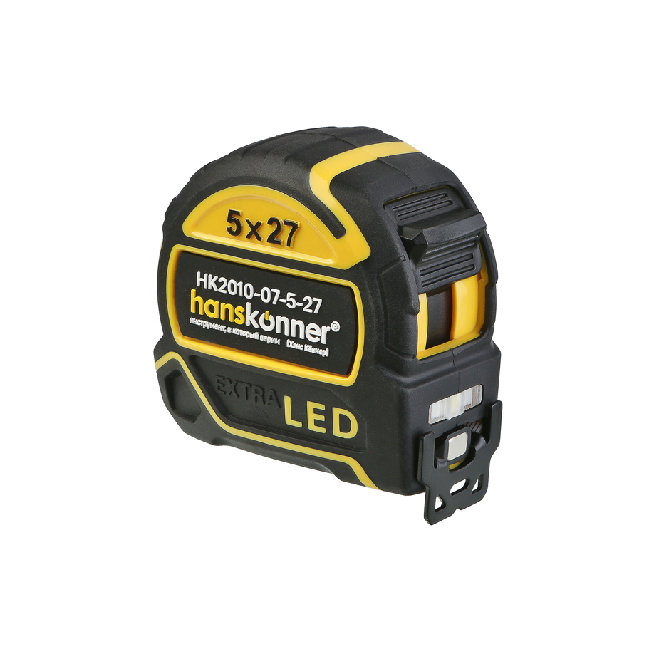 Рулетка 5x27мм, двухстор., нейлон, супермощный магнит, LED фонарь, hanskonner HK2010-07-5-27 — оснащена ярким LED фонарём для подсветки рабочей зоны.