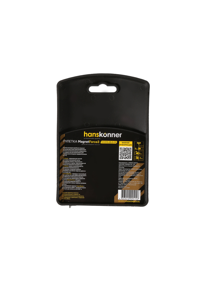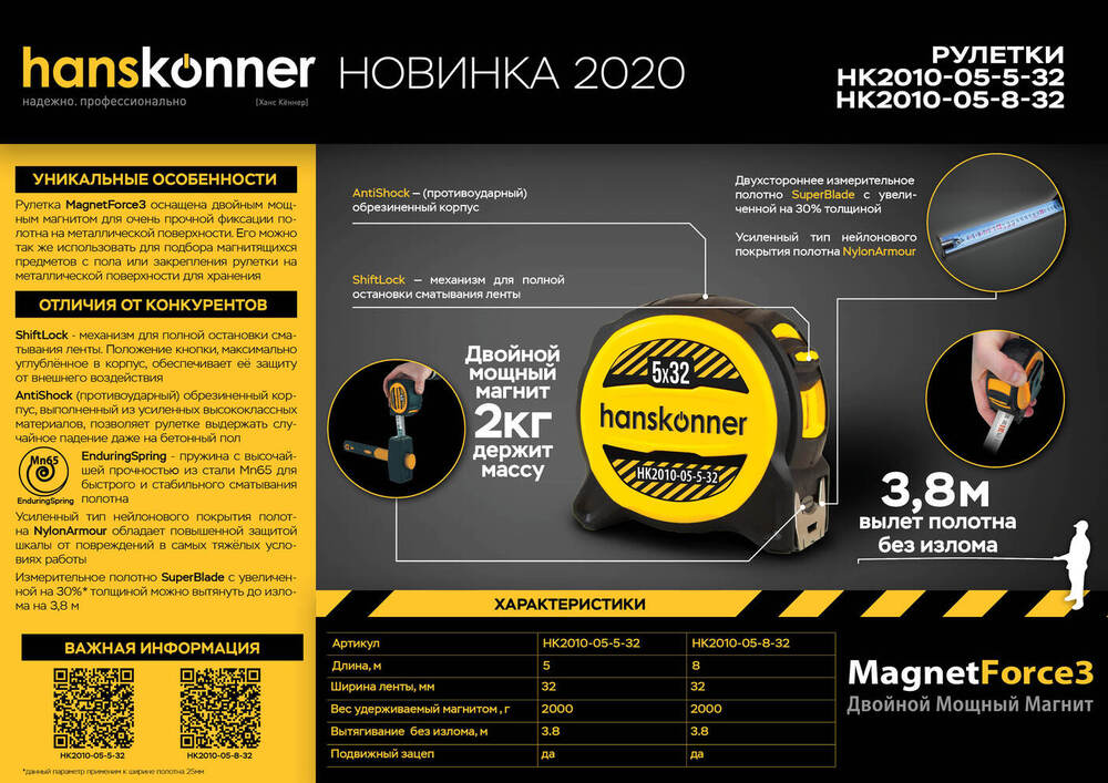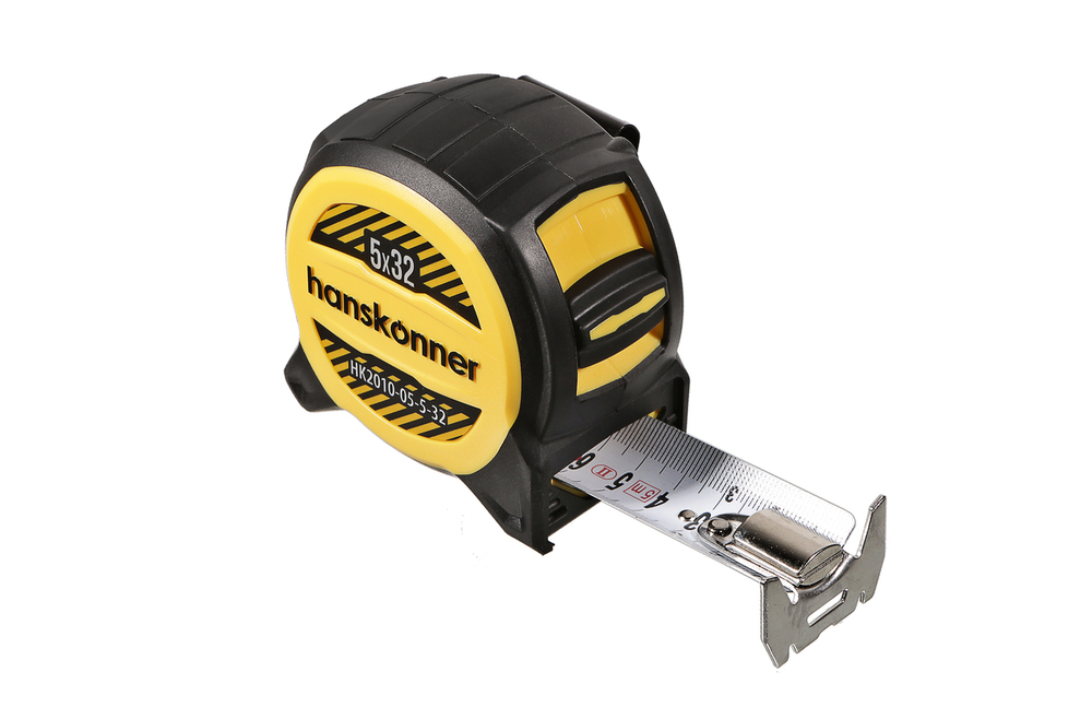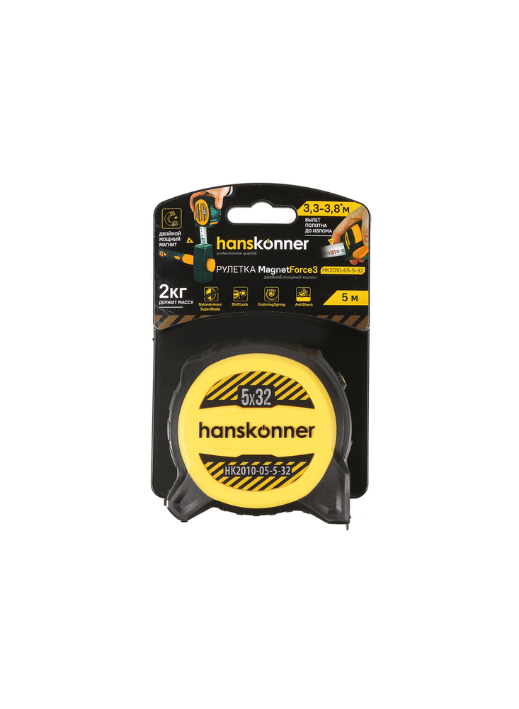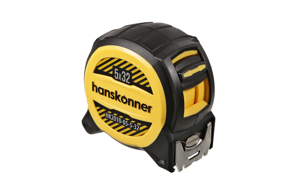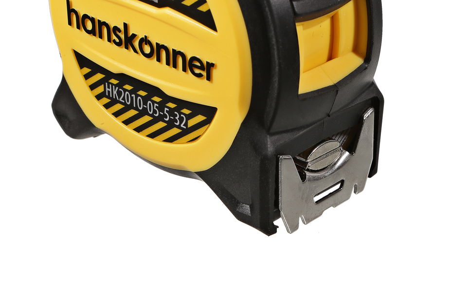 Рулетка 5x32мм, двухсторонняя, нейлон, двойной мощный магнит, Hanskonner HK2010-05-5-32 — оснащена двойным мощным магнитом для очень прочной фиксации полотна на металлической поверхности. Его можно также использовать для подбора магнитящихся предметов весом до 2кг.