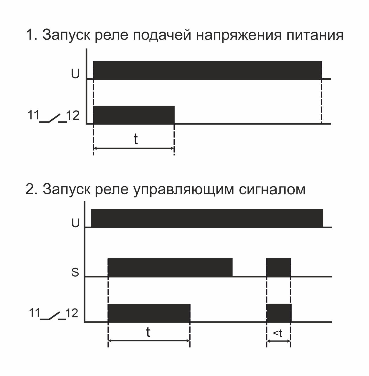 Принцип работы: 1. Запуск реле подачей напряжения питания: После включения питания контакт реле 11-12 замыкается и начинается отсчет установленной выдержки времени. По окончании отсчёта установленной выдержки времени исполнительное реле отключается и контакт 11-12 размыкается, замыкается контакт 10-11. В таком положении реле находится до отключения питания. 2. Запуск реле управляющим сигналом: При замыкании контакта S замыкается контакт 11-12 и начинается отсчет установленной выдержки времени по истечении которой выключается исполнительное реле (размыкаются контакты 11-12, замыкаются 10-11). В таком положении реле находится до отключения питания или размыкания контакта S. Если разомкнуть контакт S до истечения выдержки времени, отсчёт прекращается. При замыкании контакта S отсчёт начинается снова.