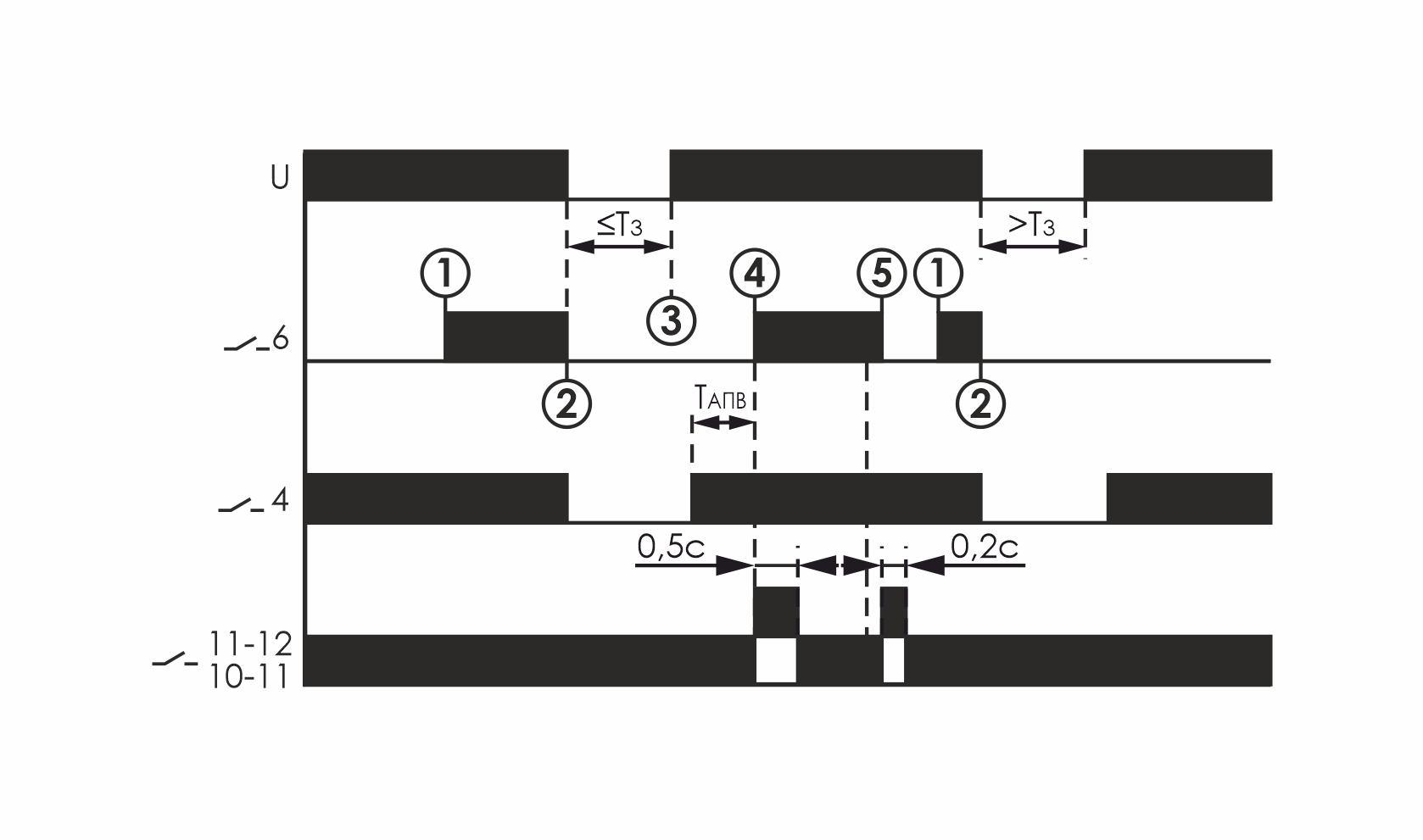 Контакт 4 предназначен для последовательного подключения устройств (каскадного включения нагрузок). Отсчет времени повторного включения осуществляется после подачи напряжения на данный контакт. Если во время отсчета времени АПВ («ТАПВ») сигнал на клемме исчезнет - повторное включение будет отменено.