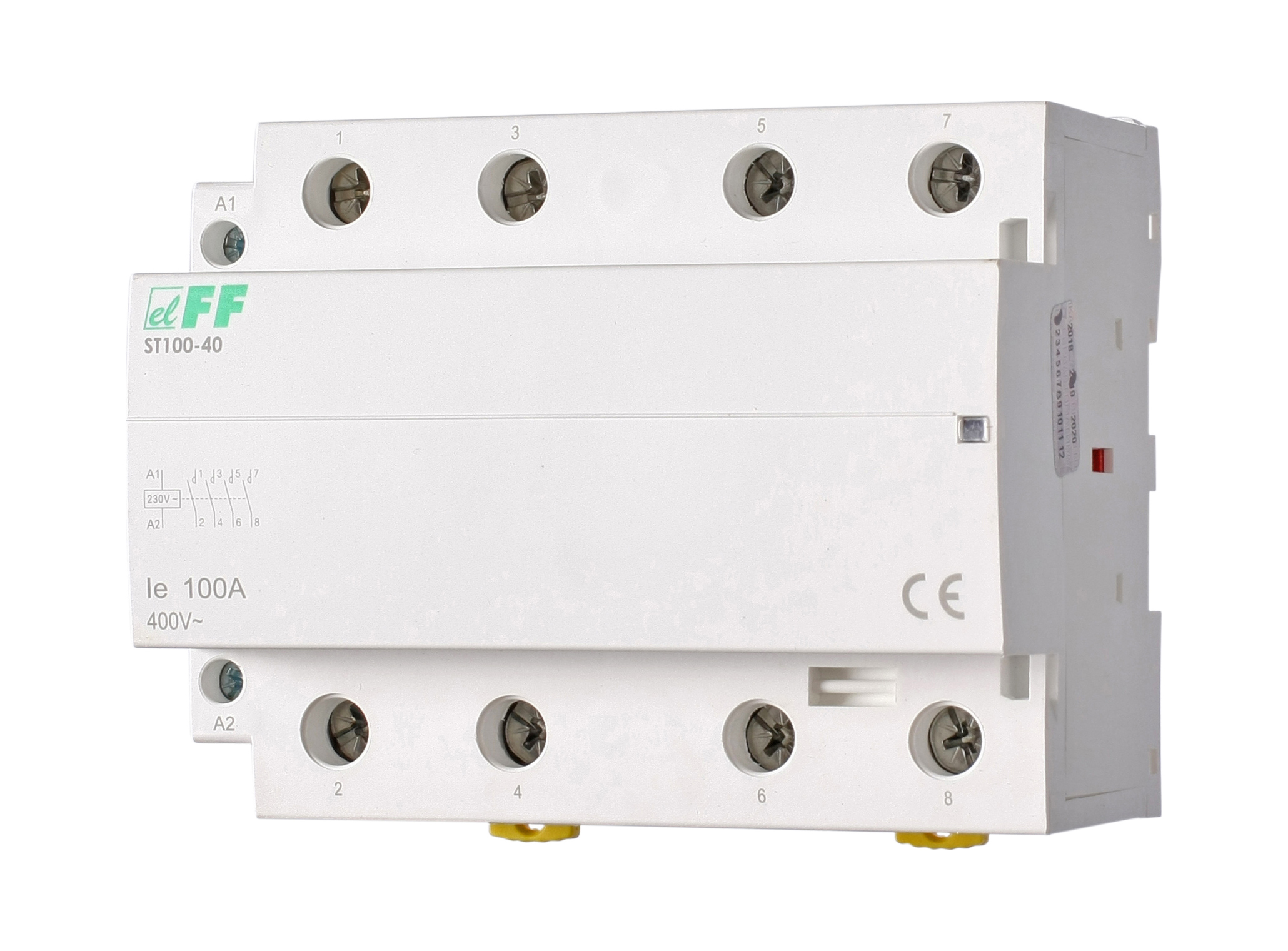 Монтаж на DIN-рейку. Предназначены для частого дистанционного включение и выключение электрических цепей повышенной мощности при нормальных условиях работы. Подача напряжения питания на катушку контактора приводит к переключению контактов. Рабочее состояние контактора сигнализируется поднятым красным флажком на лицевой панели. После отключения напряжения питания, контакты возвращаются в своё первоначальное положение.