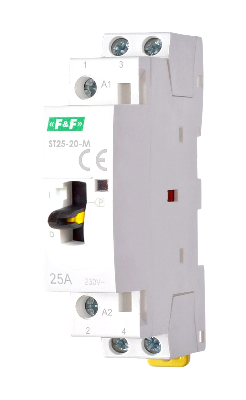 Монтаж на DIN-рейку. Предназначены для коммутации электрических цепей повышенной мощности. Наличие переключателя на лицевой панели позволяет вручную управлять контактами контактора (независимо от наличия напряжения питания на катушке).