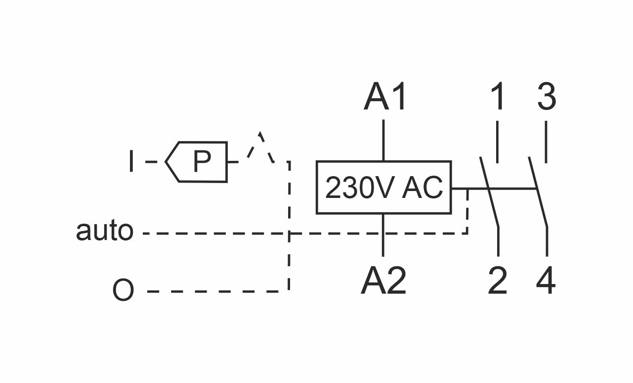 При отсутствии напряжения питания на катушке контакты контактора замкнуты. Подача напряжения питания на катушку автоматически переводит переключатель в положение "auto" и контактор работает в автоматическом режиме. Чтобы зафиксировать контакты в замкнутом состоянии независимо от наличия напряжения питания контактора необходимо в положении „I” переместить желтый рычаг блокировки влево. Рабочее состояние контактора сигнализируется поднятым красным флажком на лицевой панели.