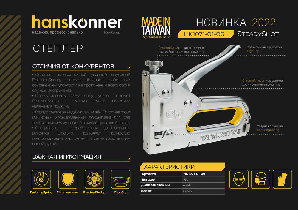 Степлер Hanskonner HK1071-01-06. Степлер SteadyShot оснащён высокопрочной ударной пружиной EnduringSping, которая сохраняет упругость на протяжении всего срока службы инструмента.