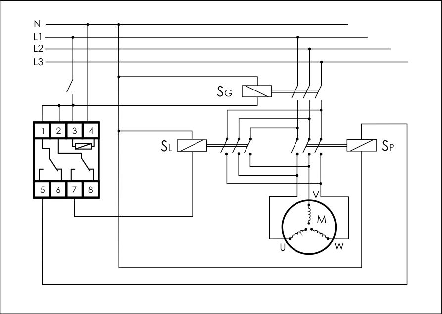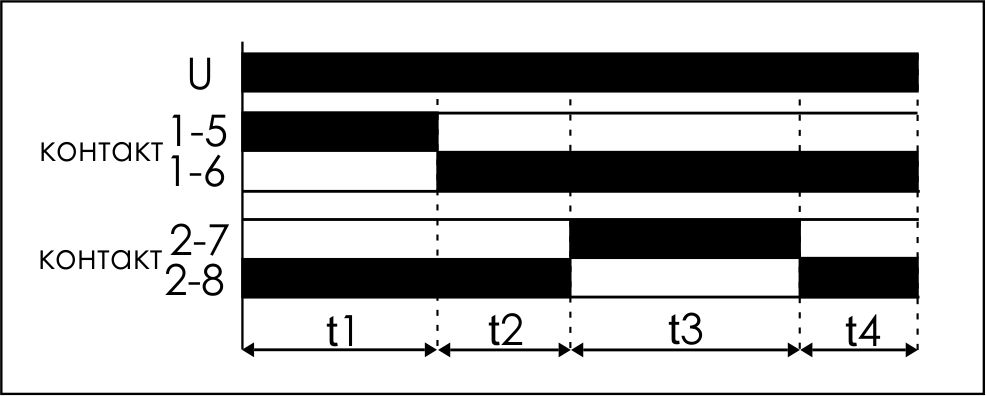 Принцип работы: При включении питания замыкаются контакты 1-5, включается контактор SR на время t1 – электродвигатель вращается вправо. По истечении времени t1 контакты 1-5 размыкаются и двигатель останавливается на время t2. По его истечении замыкаются контакты 2-7, включается контактор SL и двигатель вращается влево в течение времени t3. По его истечении размыкаются контакты 2-7 и двигатель останавливается на время t4. Затем включение на время t1 и так далее до окончания отсчёта заданного количества циклов работы (программируемый параметр) или отключения питания.