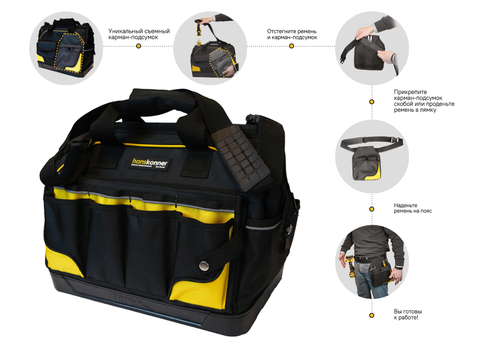Сумка для инструментов, съёмный карман-подсумок, 46 карманов, Hanskonner HKTB0146 — предназначена для сегментированного комфортного хранения инструмента, а также для его переноски.