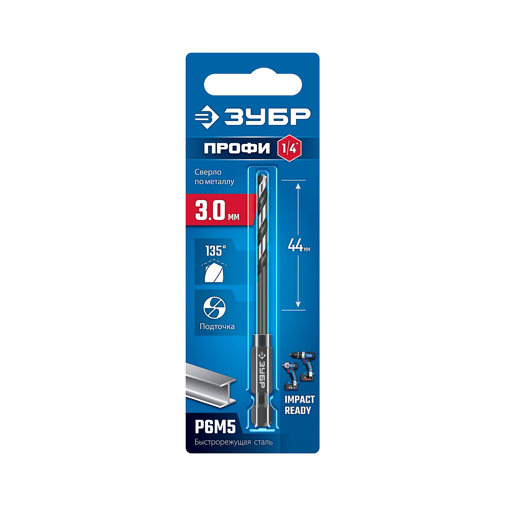 Сверло по металлу для винтовёртов и шуруповертов IMPACT READY ЗУБР НЕХ-1/4″, d 3.0 х 79 мм 29623-3_z01 - предназначено для обработки легированных и углеродистых сталей с пределом прочности до 900Н/мм^2, цветных металлов, серого чугуна и пластмассы.