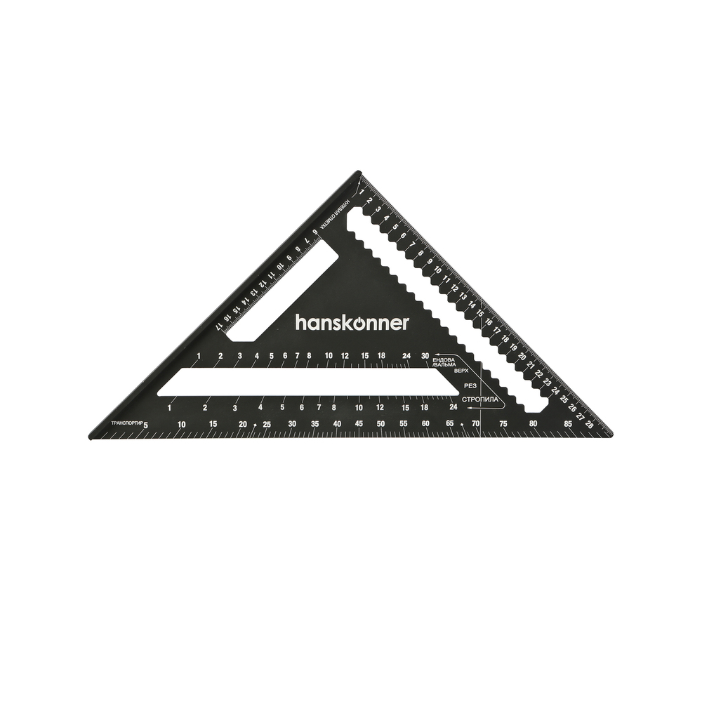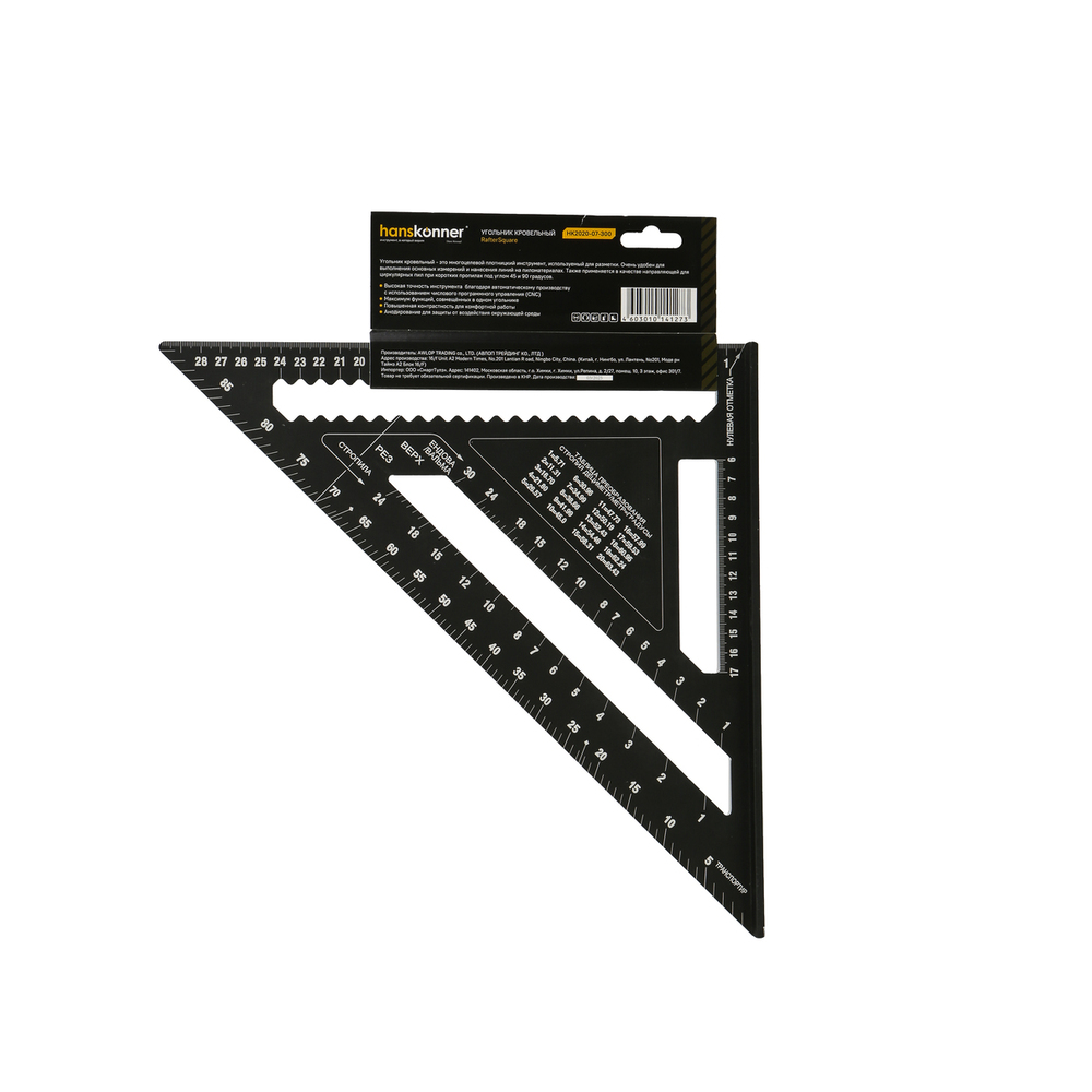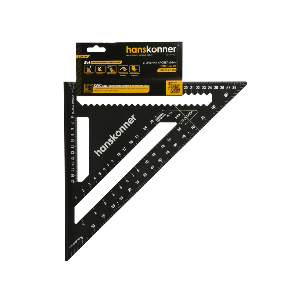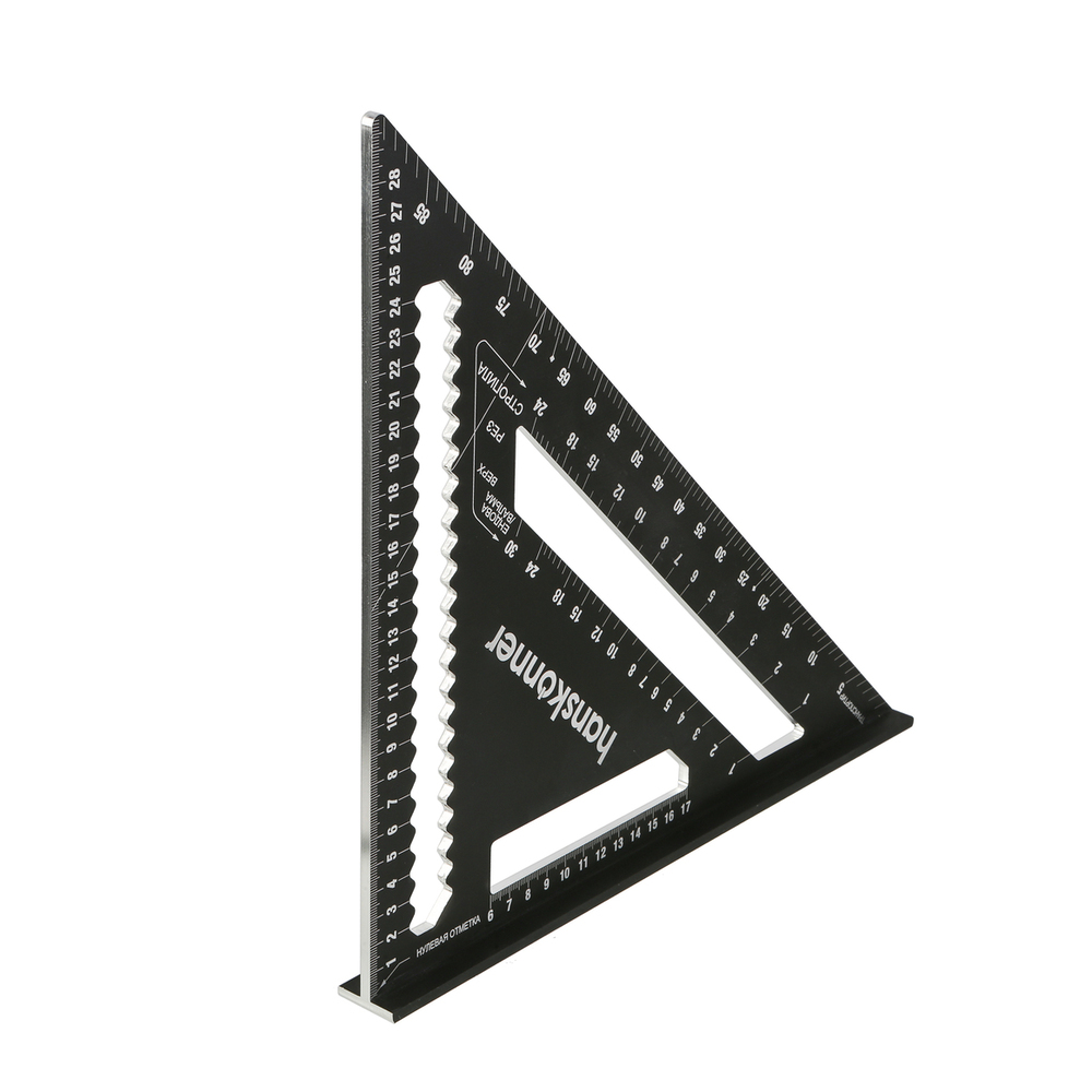 Угольник Свенсона 300мм, алюминиевый сплав, чёрный анодированный корпус, белая шкала, hanskonner HK2020-07-300 — для разметочных работ при установке кровли, а также контроля перпендикулярности конструкций, как торцовочный угольник, транспортир, рейсмус, направляющая для пилы.